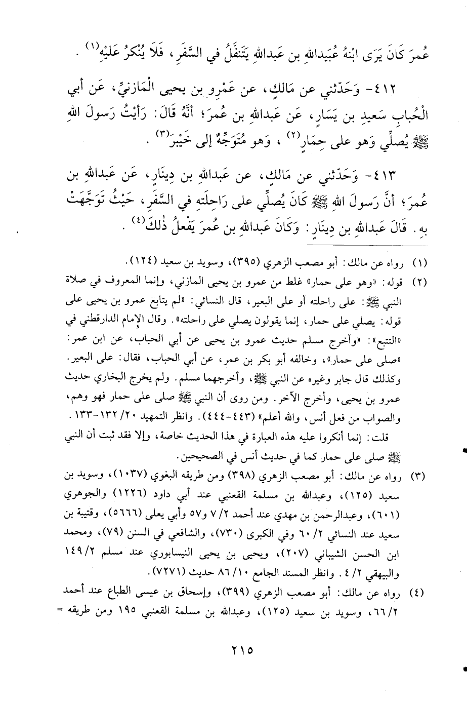 413- وَحَدَّثَنِي عَنْ مَالِكٍ (1)، عَنْ عَبْدِ اللهِ بْنِ دِينَارٍ، عَنْ عَبْدِ اللهِ بْنِ عُمَرَ؛ أَنَّ رَسُولَ اللهِ صَلى الله عَلَيهِ وَسَلمَ كَانَ يُصَلِّي عَلَى رَاحِلَتِهِ فِي السَّفَرِ، حَيْثُ تَوَجَّهَتْ بِهِ.