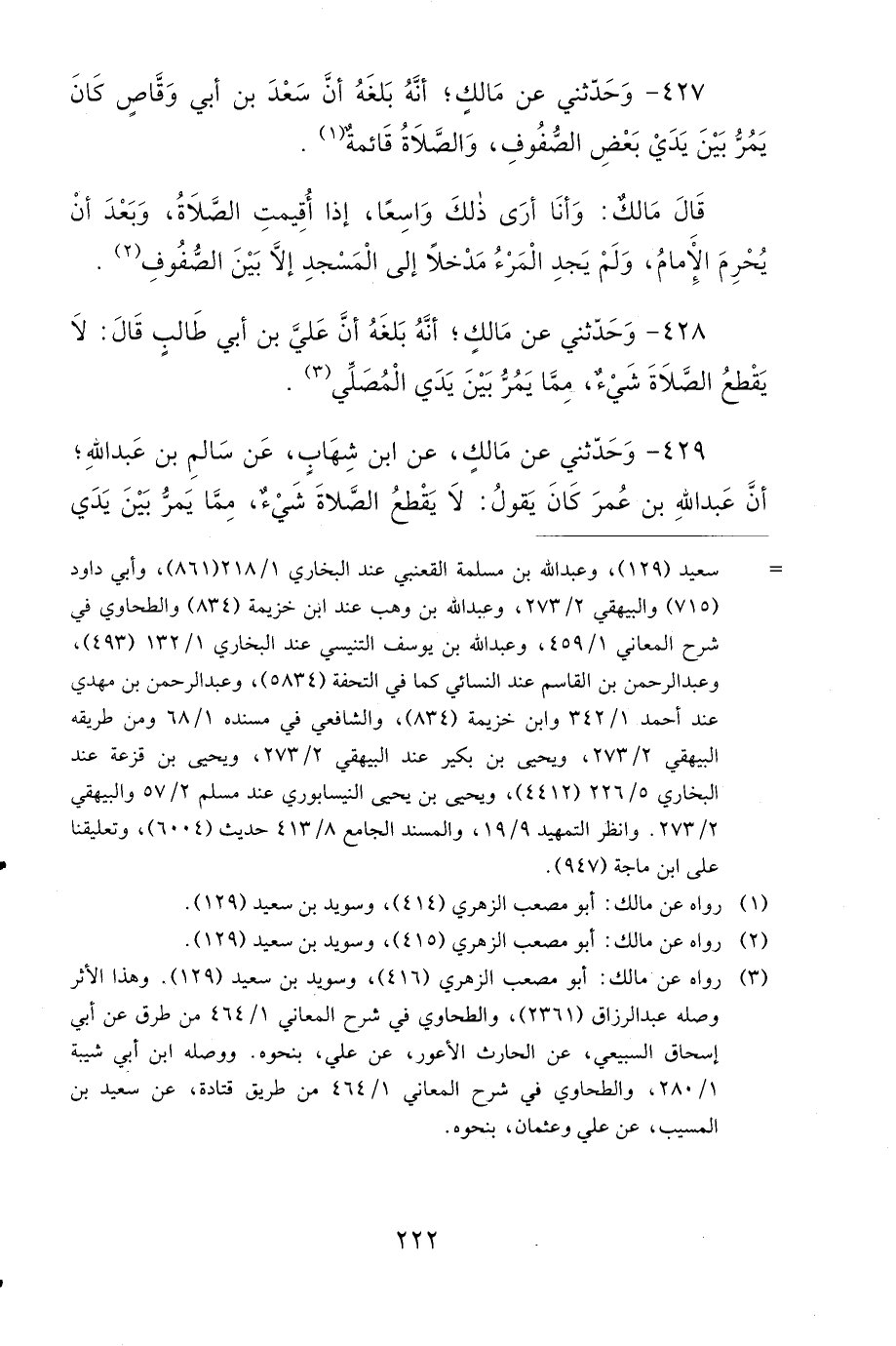 429- وَحَدَّثَنِي عَنْ مَالِكٍ، عَنِ ابْنِ شِهَابٍ، عَنْ سَالِمِ بْنِ عَبْدِ اللهِ، أَنَّ عَبْدَ اللهِ بْنَ عُمَرَ كَانَ يَقُولُ: لاَ يَقْطَعُ الصَّلاَةَ شَيْءٌ مِمَّا يَمُرُّ بَيْنَ يَدَيِ الْمُصَلِّي.