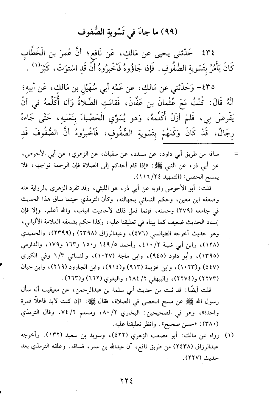435- وَحَدَّثَنِي عَنْ مالِكٍ، عَنْ عَمِّهِ أَبِي سُهَيْلِ بْنِ مَالِكٍ، عَنْ أَبِيهِ أَنَّهُ قَالَ: كُنْتُ مَعَ عُثْمَانَ بْنِ عَفَّانَ، فَقَامَتِ الصَّلاَةُ وَأَنَا أُكَلِّمُهُ فِي أَنْ يَفْرِضَ لِي، فَلَمْ أَزَلْ أُكَلِّمُهُ، وَهُوَ يُسَوِّي الْحَصْبَاءَ بِنَعْلَيْهِ، حَتَّى جَاءَهُ رِجَالٌ قَدْ كَانَ وَكَلَهُمْ بِتَسْوِيَةِ الصُّفُوفِ، فَأَخْبَرُوهُ أَنَّ الصُّفُوفَ قَدِ اسْتَوَتْ، فَقَالَ لِي: اسْتَوِ فِي الصَّفِّ، ثُمَّ كَبَّرَ.