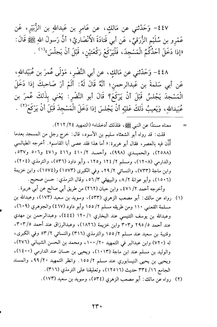 447- وَحَدَّثَنِي عَنْ مَالِكٍ، عَنْ عَامِرِ بْنِ عَبْدِ اللهِ بْنِ الزُّبَيْرِ، عَنْ عَمْرِو بْنِ سُلَيْمٍ الزُّرَقِيِّ، عَنْ أَبِي قَتَادَةَ الأَنْصَارِيِّ، أَنَّ رَسُولَ اللهِ صَلى الله عَلَيهِ وَسَلمَ قَالَ: إِذَا دَخَلَ أَحَدُكُمُ الْمَسْجِدَ، فَلْيَرْكَعْ رَكْعَتَيْنِ، قَبْلَ أَنْ يَجْلِسَ.