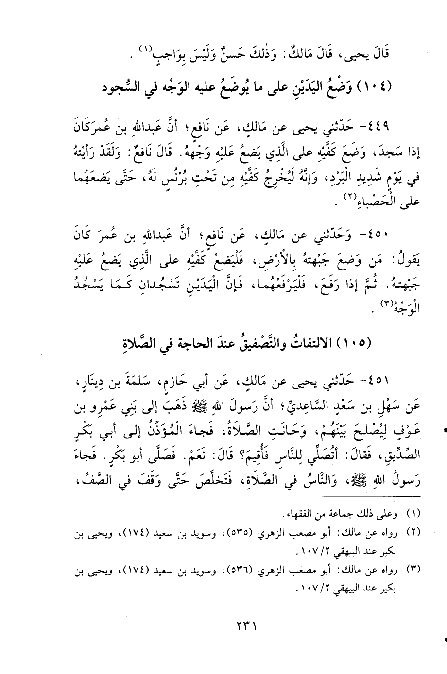 449- حَدَّثَنِي يَحْيَى، عَنْ مَالِكٍ (1)، عَنْ نَافِعٍ، أَنَّ عَبْدَ اللهِ بْنَ عُمَرَ كَانَ إِذَا سَجَدَ، وَضَعَ كَفَّيْهِ عَلَى الَّذِي يَضَعُ عَلَيْهِ وَجْهَهُ.