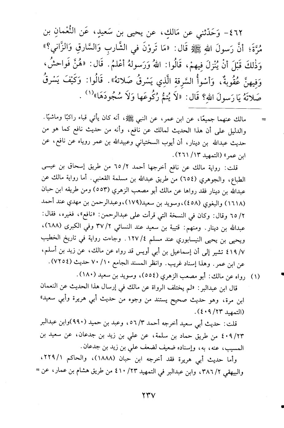 462- وَحَدَّثَنِي عَنْ مَالِكٍ، عَنْ يَحْيَى بْنِ سَعِيدٍ، عَنِ النُّعْمَانِ بْنِ مُرَّةَ، أَنَّ رَسُولَ اللهِ صَلى الله عَلَيهِ وَسَلمَ قَالَ: مَا تَرَوْنَ فِي الشَّارِبِ، وَالسَّارِقِ، وَالزَّانِي؟ وَذَلِكَ قَبْلَ أَنْ يُنْزَلَ فِيهِمْ، قَالُوا: اللهُ وَرَسُولُهُ أَعْلَمُ، قَالَ: هُنَّ فَوَاحِشُ، وَفِيهِنَّ عُقُوبَةٌ، وَأَسْوَأُ السَّرِقَةِ الَّذِي يَسْرِقُ صَلاَتَهُ، قَالُوا: وَكَيْفَ يَسْرِقُ صَلاَتَهُ يَا رَسُولَ اللهِ؟ قَالَ: لاَ يُتِمُّ رُكُوعَهَا وَلاَ سُجُودَهَا.