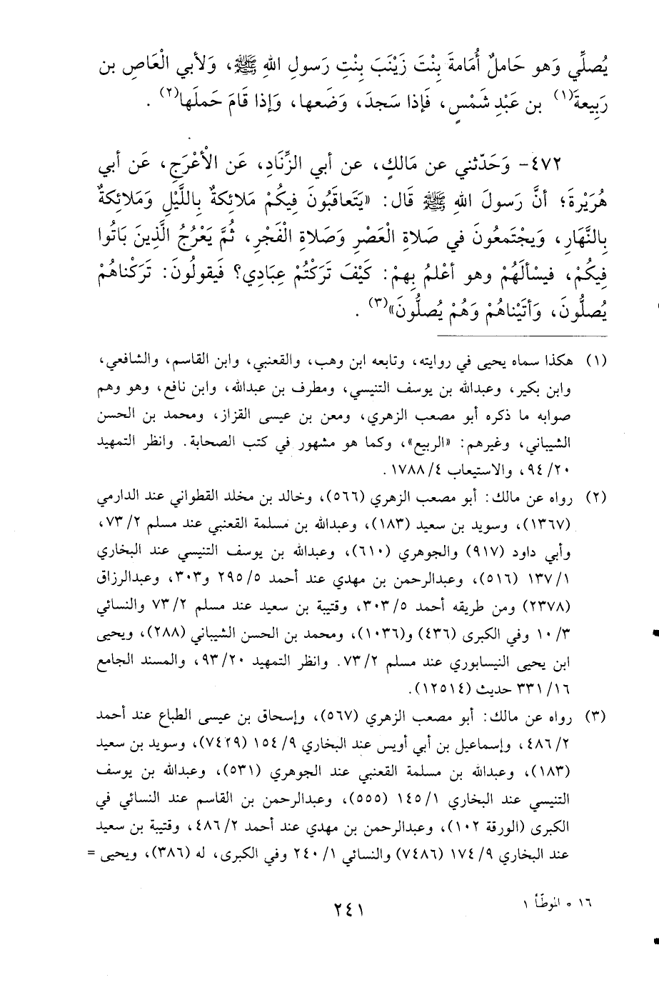 472- وَحَدَّثَنِي عَنْ مَالِكٍ، عَنْ أَبِي الزِّنَادِ، عَنِ الأَعْرَجِ، عَنْ أَبِي هُرَيْرَةَ، أَنَّ رَسُولَ اللهِ صَلى الله عَلَيهِ وَسَلمَ قَالَ: يَتَعَاقَبُونَ فِيكُمْ مَلاَئِكَةٌ بِاللَّيْلِ وَمَلاَئِكَةٌ بِالنَّهَارِ، وَيَجْتَمِعُونَ فِي صَلاَةِ الْعَصْرِ، وَصَلاَةِ الْفَجْرِ، ثُمَّ يَعْرُجُ الَّذِينَ بَاتُوا فِيكُمْ، فَيَسْأَلُهُمْ وَهُوَ أَعْلَمُ بِهِمْ: كَيْفَ تَرَكْتُمْ عِبَادِي؟ فَيَقُولُونَ: تَرَكْنَاهُمْ يُصَلُّونَ، وَأَتَيْنَاهُمْ وَهُمْ يُصَلُّونَ.