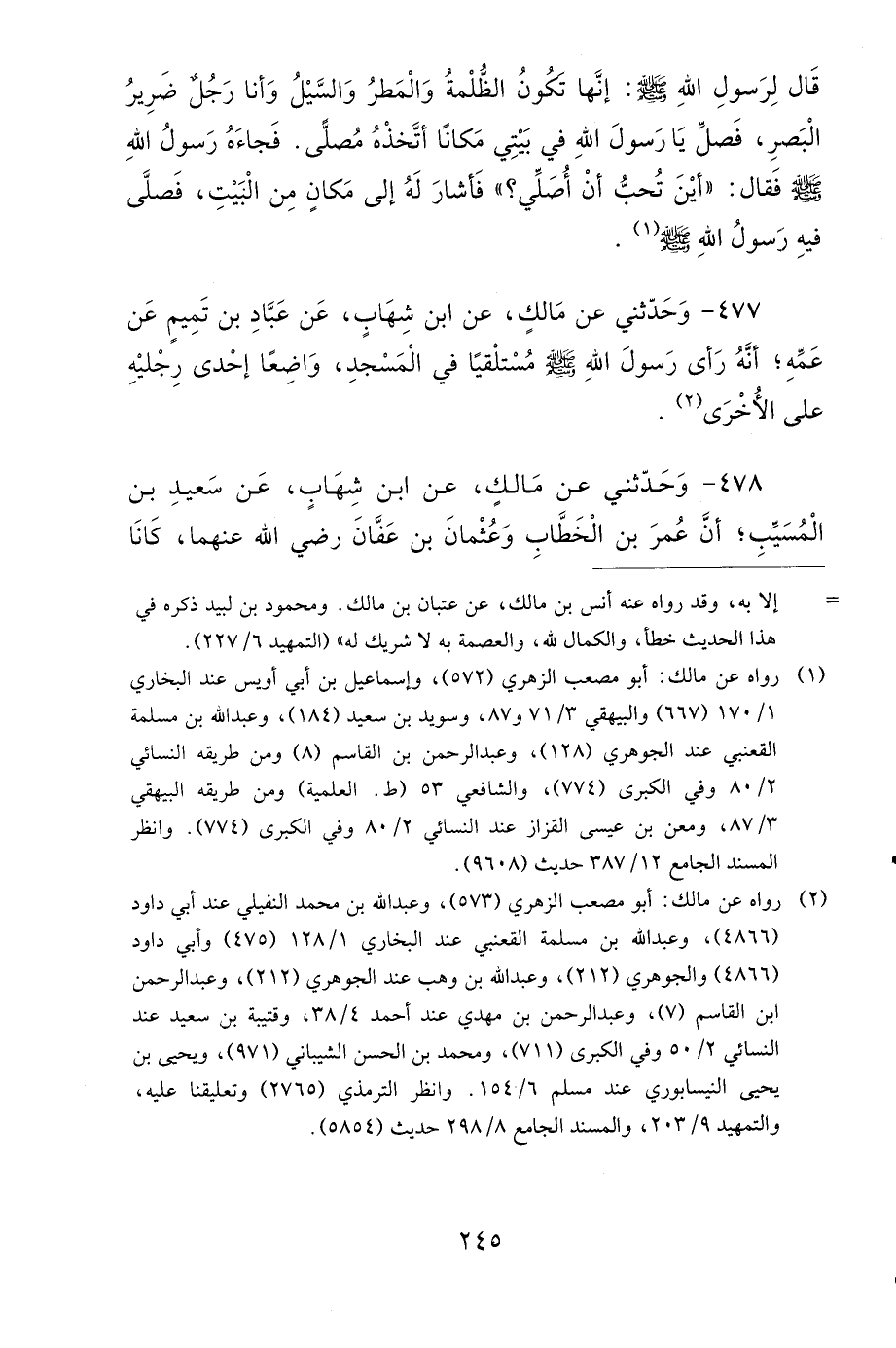 477- وَحَدَّثَنِي عَنْ مَالِكٍ، عَنِ ابْنِ شِهَابٍ، عَنْ عَبَّادِ بْنِ تَمِيمٍ، عَنْ عَمِّهِ، أَنَّهُ رَأَى رَسُولَ اللهِ صَلى الله عَلَيهِ وَسَلمَ مُسْتَلْقِيًا فِي الْمَسْجِدِ، وَاضِعًا إِحْدَى رِجْلَيْهِ عَلَى الأَخْرَى.