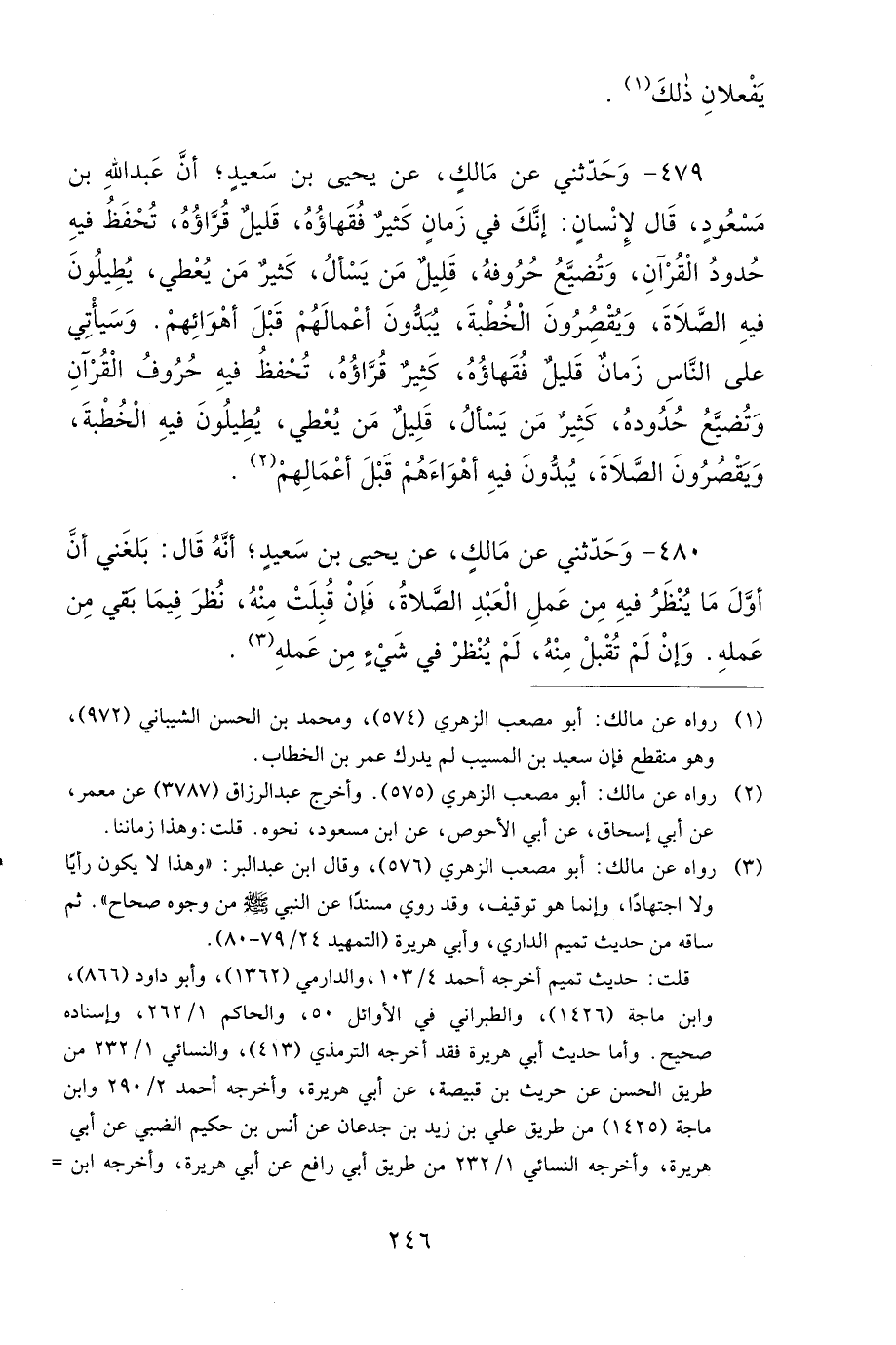 479- وَحَدَّثَنِي عَنْ مَالِكٍ، عَنْ يَحْيَى بْنِ سَعِيدٍ، أَنَّ عَبْدَ اللهِ بْنَ مَسْعُودٍ قَالَ لإِنْسَانٍ: إِنَّكَ فِي زَمَانٍ كَثِيرٌ فُقَهَاؤُهُ، قَلِيلٌ قُرَّاؤُهُ، تُحْفَظُ فِيهِ حُدُودُ الْقُرْآنِ، وَتُضَيَّعُ حُرُوفُهُ، قَلِيلٌ مَنْ يَسْأَلُ، كَثِيرٌ مَنْ يُعْطِي، يُطِيلُونَ فِيهِ الصَّلاَةَ، وَيَقْصُرُونَ الْخُطْبَةَ، يُبَدُّونَ أَعْمَالَهُمْ قَبْلَ أَهْوَائِهِمْ، وَسَيَأْتِي عَلَى النَّاسِ زَمَانٌ، قَلِيلٌ فُقَهَاؤُهُ، كَثِيرٌ قُرَّاؤُهُ، يُحْفَظُ فِيهِ حُرُوفُ الْقُرْآنِ، وَتُضَيَّعُ حُدُودُهُ، كَثِيرٌ مَنْ يَسْأَلُ، قَلِيلٌ مَنْ يُعْطِي، يُطِيلُونَ فِيهِ الْخُطْبَةَ، وَيَقْصُرُونَ الصَّلاَةَ، يُبَدُّونَ فِيهِ أَهْوَاءَهُمْ قَبْلَ أَعْمَالِهِمْ.