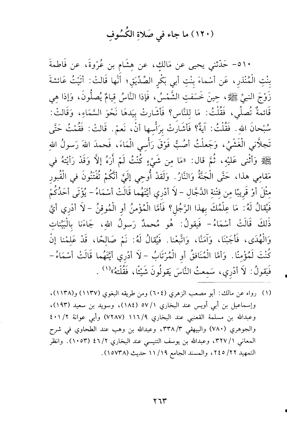 510- حَدَّثَنِي يَحْيَى، عَنْ مَالِكٍ، عَنْ هِشَامِ بْنِ عُرْوَةَ، عَنْ فَاطِمَةَ بِنْتِ الْمُنْذِرِ، عَنْ أَسْمَاءَ بِنْتِ أَبِي بَكْرٍ الصِّدِّيقِ أَنَّهَا قَالَتْ: أَتَيْتُ عَائِشَةَ، زَوْجَ النَّبِيِّ صَلى الله عَلَيهِ وَسَلمَ حِينَ خَسَفَتِ الشَّمْسُ، فَإِذَا النَّاسُ قِيَامٌ يُصَلُّونَ، وَإِذَا هِيَ قَائِمَةٌ تُصَلِّي، فَقُلْتُ: مَا لِلنَّاسِ؟ فَأَشَارَتْ بِيَدِهَا نَحْوَ السَّمَاءِ، وَقَالَتْ: سُبْحَانَ اللهِ، فَقُلْتُ: آيَةٌ؟ فَأَشَارَتْ بِرَأْسِهَا أَنْ نَعَمْ، قَالَتْ: فَقُمْتُ حَتَّى تَجَلاَّنِي الْغَشْيُ، وَجَعَلْتُ أَصُبُّ فَوْقَ رَأْسِي الْمَاءَ، فَحَمِدَ اللهَ رَسُولُ اللهِ صَلى الله عَلَيهِ وَسَلمَ وَأَثْنَى عَلَيْهِ، ثُمَّ قَالَ: مَا مِنْ شَيْءٍ كُنْتُ لَمْ أَرَهُ إِلاَّ وَقَدْ رَأَيْتُهُ فِي مَقَامِي هَذَا، حَتَّى الْجَنَّةُ وَالنَّارُ، وَلَقَدْ أُوحِيَ إِلَيَّ أَنَّكُمْ تُفْتَنُونَ فِي الْقُبُورِ مِثْلَ أَوْ قَرِيبًا مِنْ فِتْنَةِ الدَّجَّالِ، لاَ أَدْرِي أَيَّتَهُمَا قَالَتْ أَسْمَاءُ، يُؤْتَى أَحَدُكُمْ فَيُقَالُ لَهُ: مَا عِلْمُكَ بِهَذَا الرَّجُلِ؟ فَأَمَّا الْمُؤْمِنُ أَوِ الْمُوقِنُ، لاَ أَدْرِي أَيَّ ذَلِكَ قَالَتْ أَسْمَاءُ، فَيَقُولُ: هُوَ مُحَمَّدٌ رَسُولُ اللهِ، جَاءَنَا بِالْبَيِّنَاتِ وَالْهُدَى، فَأَجَبْنَا، وَآمَنَّا، وَاتَّبَعْنَا، فَيُقَالُ لَهُ: نَمْ صَالِحًا، قَدْ عَلِمْنَا إِنْ كُنْتَ لَمُؤْمِنًا، وَأَمَّا الْمُنَافِقُ أَوِ الْمُرْتَابُ، لاَ أَدْرِي أَيَّتَهُمَا قَالَتْ أَسْمَاءُ، فَيَقُولُ: لاَ أَدْرِي، سَمِعْتُ النَّاسَ يَقُولُونَ شَيْئًا فَقُلْتُهُ.