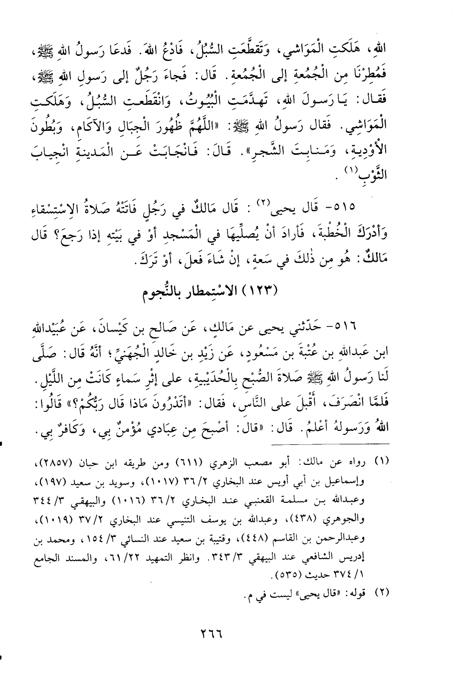 516- حَدَّثَنِي يَحْيَى، عَنْ مَالِكٍ، عَنْ صَالِحِ بْنِ كَيْسَانَ، عَنْ عُبَيْدِ اللهِ بْنِ عَبْدِ اللهِ بْنِ عُتْبَةَ بْنِ مَسْعُودٍ، عَنْ زَيْدِ بْنِ خَالِدٍ الْجُهَنِيِّ، أَنَّهُ قَالَ: صَلَّى لَنَا رَسُولُ اللهِ صَلى الله عَلَيهِ وَسَلمَ صَلاَةَ الصُّبْحِ بِالْحُدَيْبِيَةِ، عَلَى إِثْرِ سَمَاءٍ كَانَتْ مِنَ اللَّيْلِ، فَلَمَّا انْصَرَفَ، أَقْبَلَ عَلَى النَّاسِ، فَقَالَ: أَتَدْرُونَ مَاذَا قَالَ رَبُّكُمْ؟ قَالُوا: اللهُ وَرَسُولُهُ أَعْلَمُ، قَالَ: قَالَ: أَصْبَحَ مِنْ عِبَادِي مُؤْمِنٌ بِي، وَكَافِرٌ بِي، فَأَمَّا مَنْ قَالَ: مُطِرْنَا بِفَضْلِ اللهِ وَرَحْمَتِهِ، فَذَلِكَ مُؤْمِنٌ بِي كَافِرٌ بِالْكَوْكَبِ، وَأَمَّا مَنْ قَالَ: مُطِرْنَا بِنَوْءِ كَذَا وَكَذَا، فَذَلِكَ كَافِرٌ بِي، مُؤْمِنٌ بِالْكَوْكَبِ.