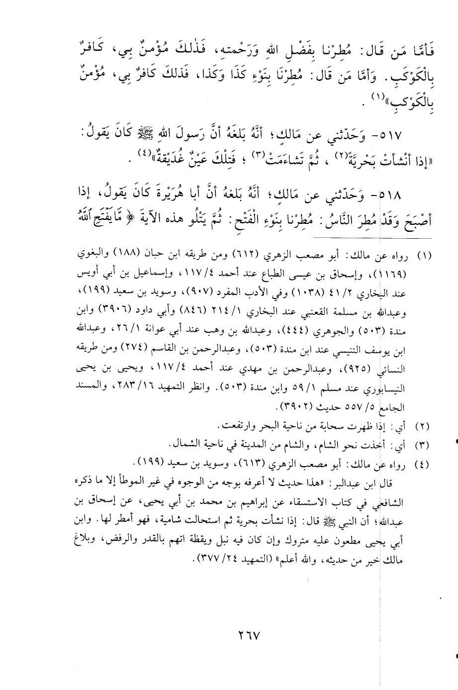 518- وَحَدَّثَنِي عَنْ مَالِكٍ؛ أَنَّهُ بَلَغَهُ، أَنَّ أَبَا هُرَيْرَةَ كَانَ يَقُولُ، إِذَا أَصْبَحَ وَقَدْ مُطِرَ النَّاسُ: مُطِرْنَا بِنَوْءِ الْفَتْحِ، ثُمَّ يَتْلُو هَذِهِ الآيَةَ: {مَا يَفْتَحِ اللهُ لِلنَّاسِ مِنْ رَحْمَةٍ فَلاَ مُمْسِكَ لَهَا}.