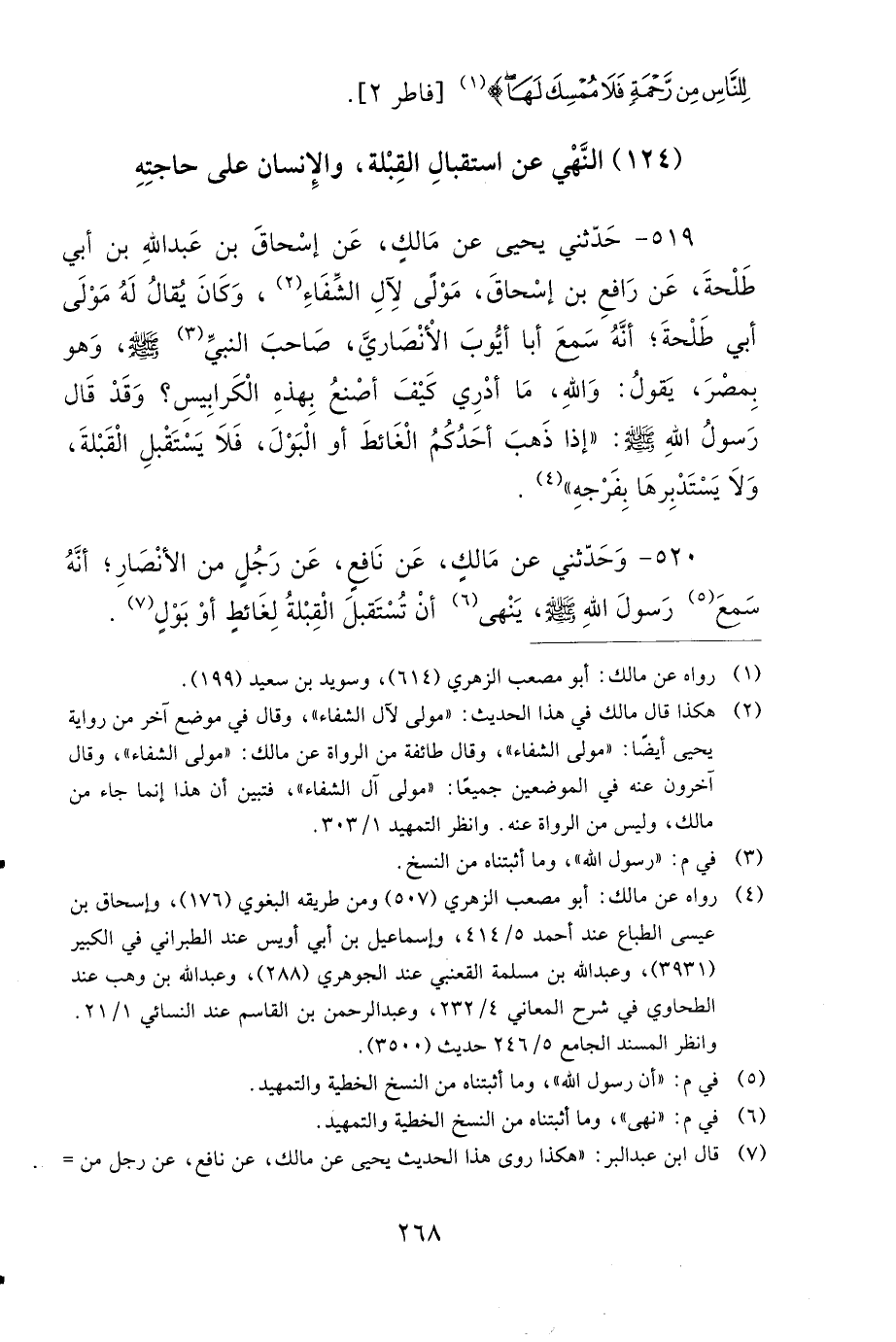 520- وَحَدَّثَنِي عَنْ مَالِكٍ، عَنْ نَافِعٍ، عَنْ رَجُلٍ مِنَ الأَنْصَارِ، أَنَّهُ سَمِعَ رَسُولَ اللهِ صَلى الله عَلَيهِ وَسَلمَ يَنْهَى أَنْ تُسْتَقْبَلَ الْقِبْلَةُ لِغَائِطٍ أَوْ بَوْلٍ.