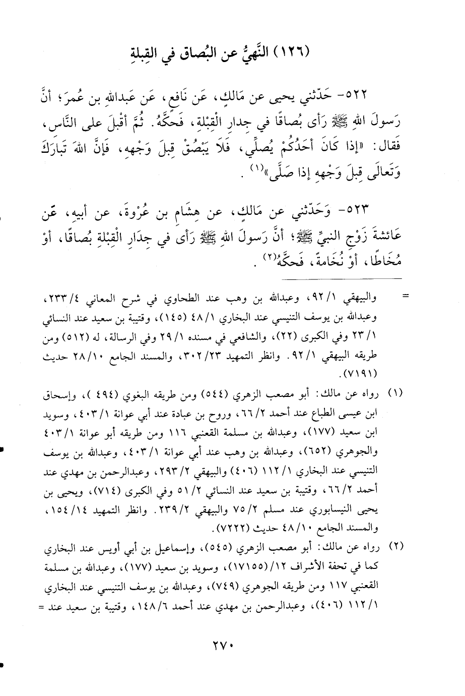 523- وَحَدَّثَنِي عَنْ مَالِكٍ، عَنْ هِشَامِ بْنِ عُرْوَةَ، عَنْ أَبِيهِ، عَنْ عَائِشَةَ، زَوْجِ النَّبِيِّ صَلى الله عَلَيهِ وَسَلمَ، أَنَّ رَسُولَ اللهِ صَلى الله عَلَيهِ وَسَلمَ رَأَى فِي جِدَارِ الْقِبْلَةِ بُصَاقًا أَوْ مُخَاطًا أَوْ نُخَامَةً، فَحَكَّهُ.