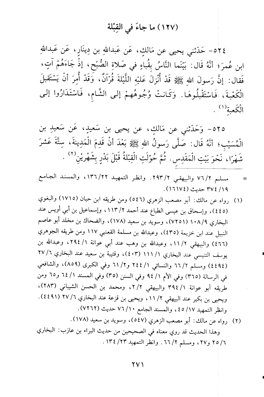 524- حَدَّثَنِي يَحْيَى، عَنْ مَالِكٍ (1)، عَنْ عَبْدِ اللهِ بْنِ دِينَارٍ، عَنْ عَبْدِ اللهِ بْنِ عُمَرَ، أَنَّهُ قَالَ: بَيْنَمَا النَّاسُ بِقُبَاءٍَ، فِي صَلاَةِ الصُّبْحِ، إِذْ جَاءَهُمْ آتٍ، فَقَالَ: إِنَّ رَسُولَ اللهِ صَلى الله عَلَيهِ وَسَلمَ قَدْ أُنْزِلَ عَلَيْهِ اللَّيْلَةَ قُرْآنٌ، وَقَدْ أُمِرَ أَنْ يَسْتَقْبِلَ الْكَعْبَةَ، فَاسْتَقْبَِلُوهَا، وَكَانَتْ وُجُوهُهُمْ إِلَى الشَّامِ، فَاسْتَدَارُوا إِلَى الْكَعْبَةِ.