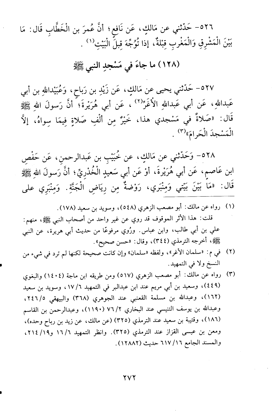 527- حَدَّثَنِي يَحْيَى، عَنْ مَالِكٍ، عَنْ زَيْدِ بْنِ رَبَاحٍ، وَعُبَيْدِ اللهِ بْنِ أَبِي عَبْدِ اللهِ، عَنْ أَبِي عَبْدِ اللهِ الأَغَرِّ، عَنْ أَبِي هُرَيْرَةَ، أَنَّ رَسُولَ اللهِ صَلى الله عَلَيهِ وَسَلمَ قَالَ: صَلاَةٌ فِي مَسْجِدِي هَذَا، خَيْرٌ مِنْ أَلْفِ صَلاَةٍ فِيمَا سِوَاهُ، إِلاَّ الْمَسْجِدَ الْحَرَامَ.