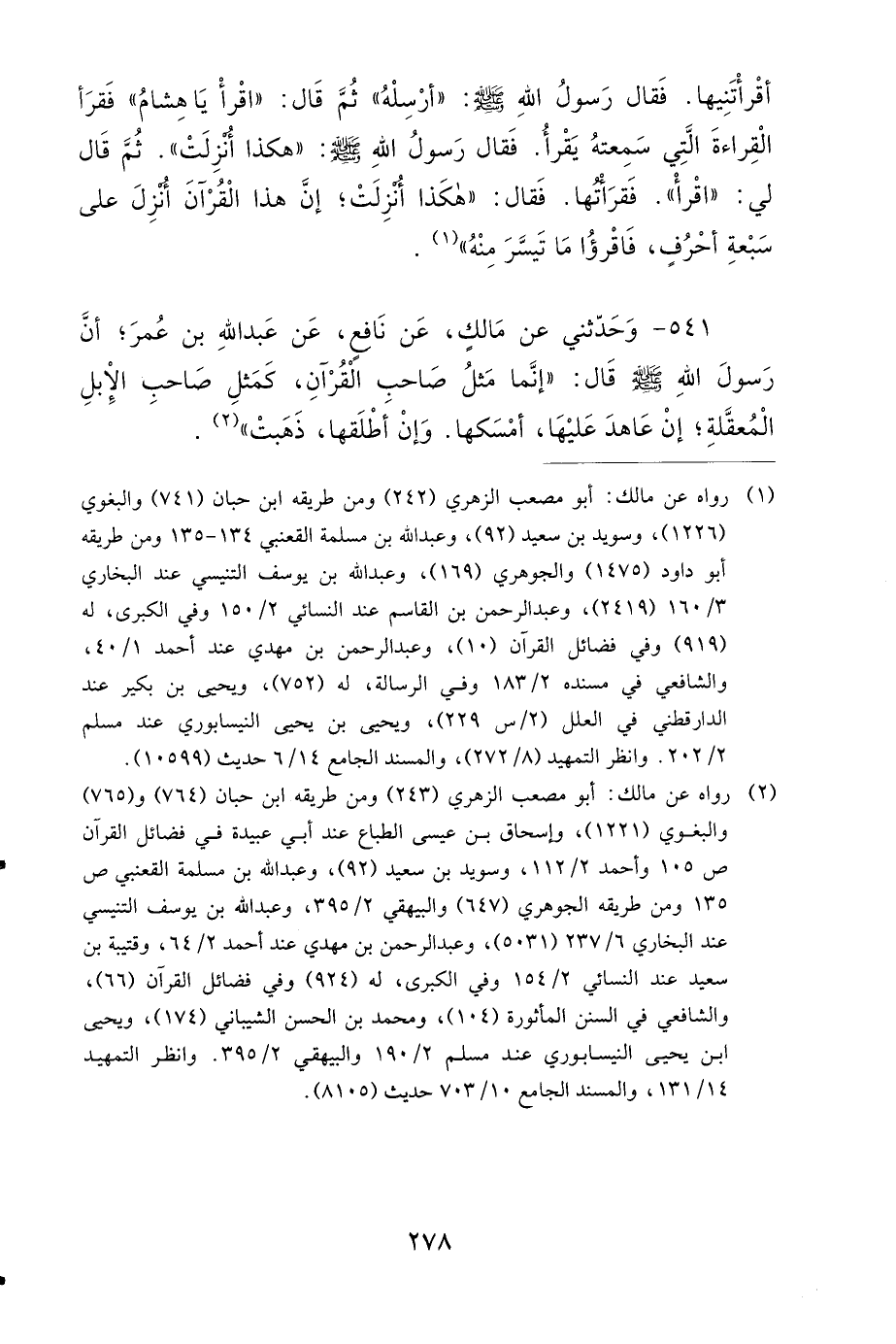 541- وَحَدَّثَنِي عَنْ مَالِكٍ (1)، عَنْ نَافِعٍ، عَنْ عَبْدِ اللهِ بْنِ عُمَرَ؛ أَنَّ رَسُولَ اللهِ صَلى الله عَلَيهِ وَسَلمَ قَالَ: إِنَّمَا مَثَلُ صَاحِبِ الْقُرْآنِ، كَمَثَلِ صَاحِبِ الإِبِلِ الْمُعَقَّلَةِ، إِنْ عَاهَدَ عَلَيْهَا أَمْسَكَهَا، وَإِنْ أَطْلَقَهَا ذَهَبَتْ.