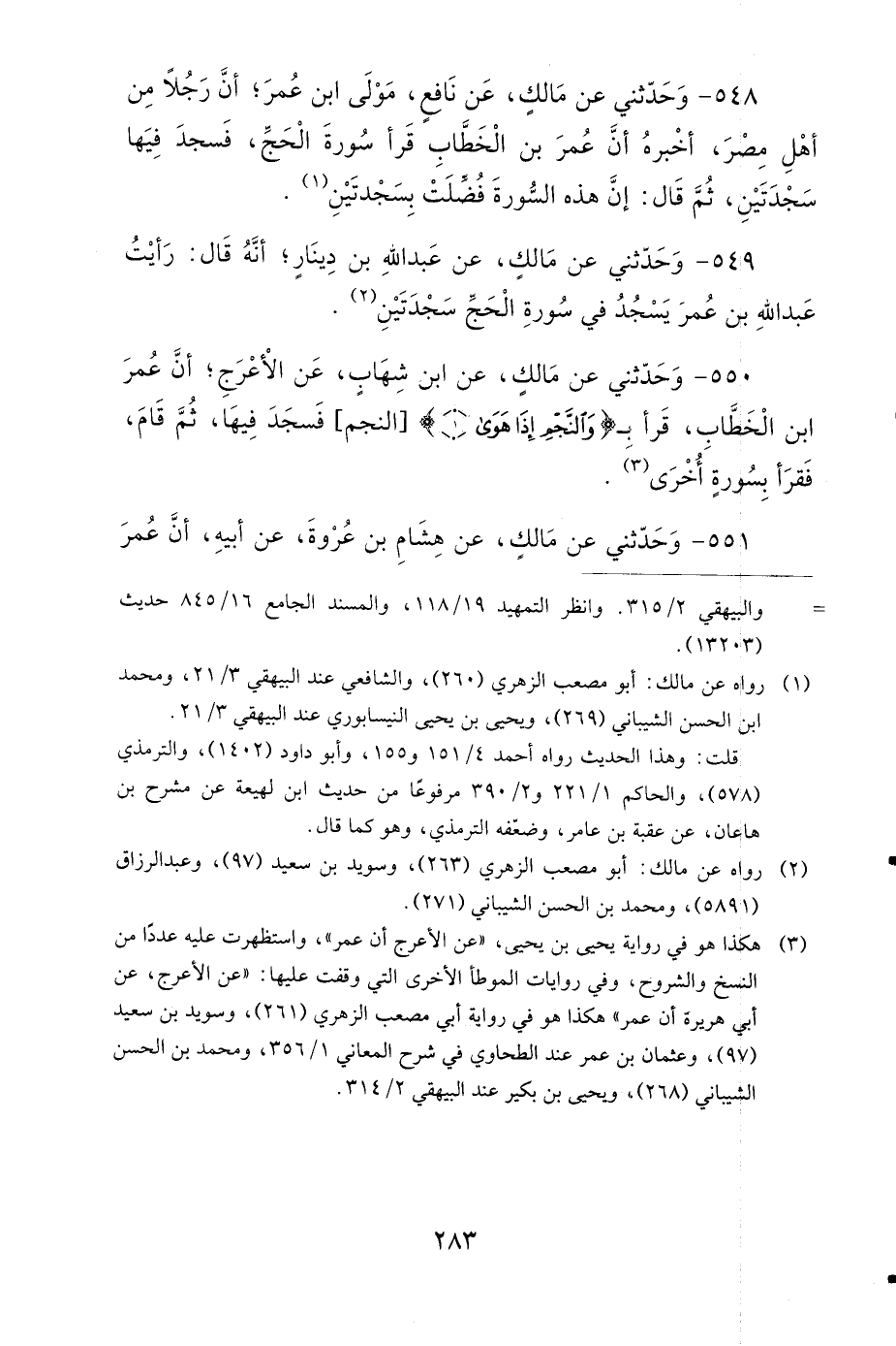 550- وَحَدَّثَنِي عَنْ مَالِكٍ، عَنِ ابْنِ شِهَابٍ، عَنِ الأَعْرَجِ، أَنَّ عُمَرَ بْنَ الْخَطَّابِ قَرَأَ بِـ: {وَالنَّجْمِ إِذَا هَوَى} فَسَجَدَ فِيهَا، ثُمَّ قَامَ، فَقَرَأَ بِسُورَةٍ أُخْرَى.