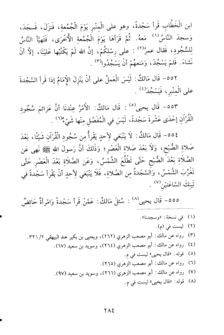 553- قَالَ يَحْيَى: قَالَ مَالِكٌ: الأَمْرُ عِنْدَنَا أَنَّ عَزَائِمَ سُجُودِ الْقُرْآنِ إِحْدَى عَشْرَةَ سَجْدَةً، لَيْسَ فِي الْمُفَصَّلِ مِنْهَا شَيْءٌ.