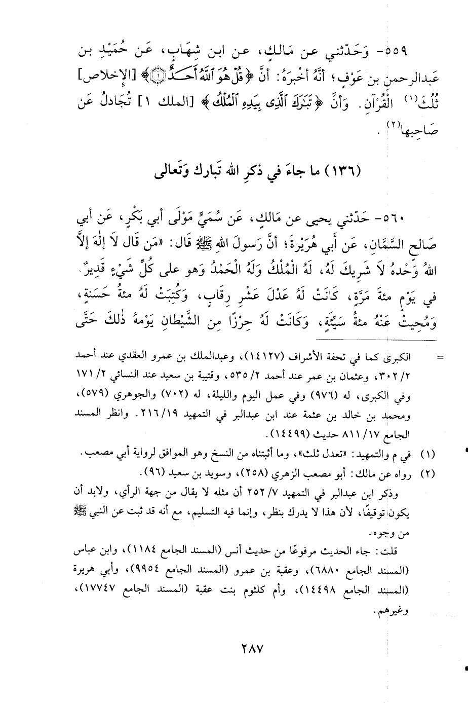 560- حَدَّثَنِي يَحْيَى، عَنْ مَالِكٍ، عَنْ سُمَيٍّ، مَوْلَى أَبِي بَكْرٍ، عَنْ أَبِي صَالِحٍ السَّمَّانِ، عَنْ أَبِي هُرَيْرَةَ، أَنَّ رَسُولَ اللهِ صَلى الله عَلَيهِ وَسَلمَ قَالَ: مَنْ قَالَ: لاَ إِلَهَ إِلاَّ اللهُ، وَحْدَهُ لاَ شَرِيكَ لَهُ، لَهُ الْمُلْكُ وَلَهُ الْحَمْدُ، وَهُوَ عَلَى كُلِّ شَيْءٍ قَدِيرٌ، فِي يَوْمٍ مِئَةَ مَرَّةٍ، كَانَتْ لَهُ عَدْلَ عَشْرِ رِقَابٍ، وَكُتِبَتْ لَهُ مِئَةُ حَسَنَةٍ، وَمُحِيَتْ عَنْهُ مِئَةُ سَيِّئَةٍ، وَكَانَتْ لَهُ حِرْزًا مِنَ الشَّيْطَانِ، يَوْمَهُ ذَلِكَ حَتَّى يُمْسِيَ، وَلَمْ يَأْتِ أَحَدٌ بِأَفْضَلَ مِمَّا جَاءَ بِهِ، إِلاَّ أَحَدٌ عَمِلَ أَكْثَرَ مِنْ ذَلِكَ.
