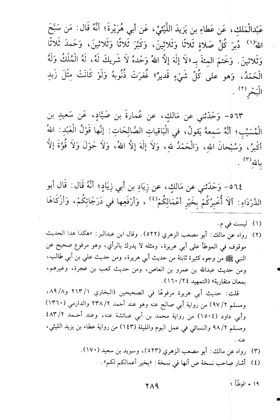 564- وَحَدَّثَنِي عَنْ مَالِكٍ، عَنْ زِيَادِ بْنِ أَبِي زِيَادٍ، أَنَّهُ قَالَ: قَالَ أَبُو الدَّرْدَاءِ: أَلاَ أُخْبِرُكُمْ بِخَيْرِ أَعمَالِكُمْ، وَأَرْفَعِهَا فِي دَرَجَاتِكُمْ، وَأَزْكَاهَا عِنْدَ مَلِيكِكُمْ، وَخَيْرٍ لَكُمْ مِنْ إِعْطَاءِ الذَّهَبِ وَالْوَرِقِ، وَخَيْرٍ لَكُمْ مِنْ أَنْ تَلْقَوْا عَدُوَّكُمْ، فَتَضْرِبُوا أَعْنَاقَهُمْ، وَيَضْرِبُوا أَعْنَاقَكُمْ؟ قَالُوا: بَلَى، قَالَ: ذِكْرُ اللهِ.