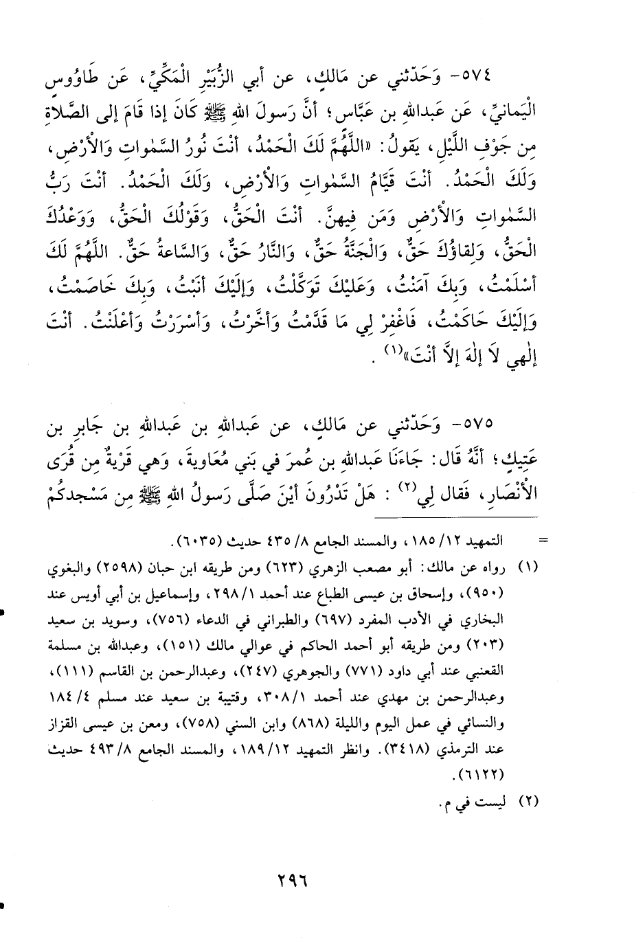574- وَحَدَّثَنِي عَنْ مالِكٍ، عَنْ أَبِي الزُّبَيْرِ الْمَكِّيِّ، عَنْ طَاوُوسٍ الْيَمَانِيِّ، عَنْ عَبْدِ اللهِ بْنِ عَبَّاسٍ؛ أَنَّ رَسُولَ اللهِ صَلى الله عَلَيهِ وَسَلمَ كَانَ إِذَا قَامَ إِلَى الصَّلاَةِ مِنْ جَوْفِ اللَّيْلِ، يَقُولُ: اللهُمَّ لَكَ الْحَمْدُ، أَنْتَ نُورُ السَّمَاوَاتِ وَالأَرْضِ، وَلَكَ الْحَمْدُ، أَنْتَ قَيَّامُ السَّمَاوَاتِ وَالأَرْضِ، وَلَكَ الْحَمْدُ، أَنْتَ رَبُّ السَّمَاوَاتِ وَالأَرْضِ وَمَنْ فِيهِنَّ، أَنْتَ الْحَقُّ، وَقَوْلُكَ الْحَقُّ، وَوَعْدُكَ الْحَقُّ، وَلِقَاؤُكَ حَقٌّ، وَالْجَنَّةُ حَقٌّ، وَالنَّارُ حَقٌّ، وَالسَّاعَةُ حَقٌّ، اللهُمَّ لَكَ أَسْلَمْتُ، وَبِكَ آمَنْتُ، وَعَلَيْكَ تَوَكَّلْتُ، وَإِلَيْكَ أَنَبْتُ، وَبِكَ خَاصَمْتُ، وَإِلَيْكَ حَاكَمْتُ، فَاغْفِرْ لِي مَا قَدَّمْتُ وَأَخَّرْتُ، وَأَسْرَرْتُ وَأَعْلَنْتُ، أَنْتَ إِلَهِي، لاَ إِلَهَ إِلاَّ أَنْتَ.