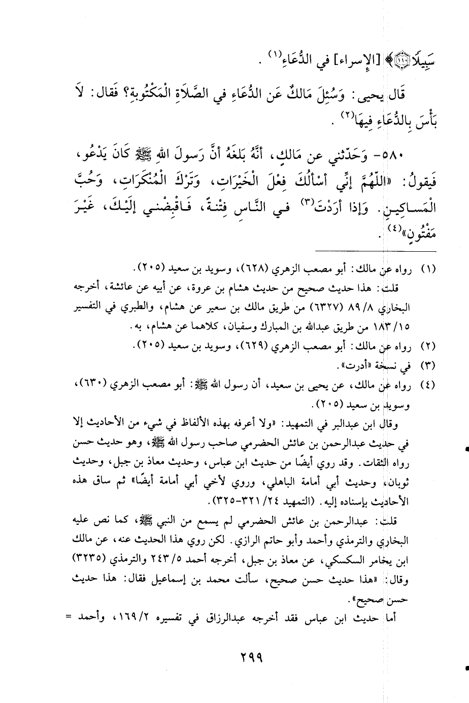 580- وَحَدَّثَنِي عَنْ مَالِكٍ؛ أَنَّهُ بَلَغَهُ، أَنَّ رَسُولَ اللهِ صَلى الله عَلَيهِ وَسَلمَ كَانَ يَدْعُو فَيَقُولُ: اللهُمَّ إِنِّي أَسْأَلُكَ فِعْلَ الْخَيْرَاتِ، وَتَرْكَ الْمُنْكَرَاتِ، وَحُبَّ الْمَسَاكِينِ، وَإِذَا أَرَدْتَ فِي النَّاسِ فِتْنَةً، فَاقْبِضْنِي إِلَيْكَ غَيْرَ مَفْتُونٍ.