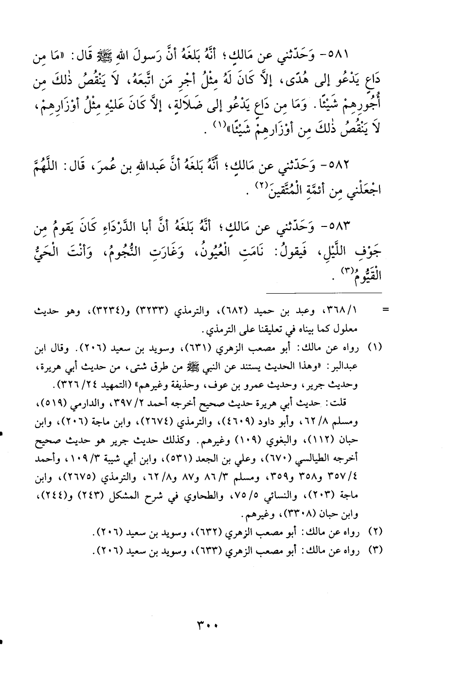 581- وَحَدَّثَنِي عَنْ مَالِكٍ؛ أَنَّهُ بَلَغَهُ، أَنَّ رَسُولَ اللهِ صَلى الله عَلَيهِ وَسَلمَ قَالَ: مَا مِنْ دَاعٍ يَدْعُو إِلَى هُدًى، إِلاَّ كَانَ لَهُ مِثْلُ أَجْرِ مَنِ اتَّبَعَهُ، لاَ يَنْقُصُ ذَلِكَ مِنْ أُجُورِهِمْ شَيْئًا، وَمَا مِنْ دَاعٍ يَدْعُو إِلَى ضَلاَلَةٍ، إِلاَّ كَانَ عَلَيْهِ مِثْلُ أَوْزَارِهِمْ، لاَ يَنْقُصُ ذَلِكَ مِنْ أَوْزَارِهِمْ شَيْئًا.