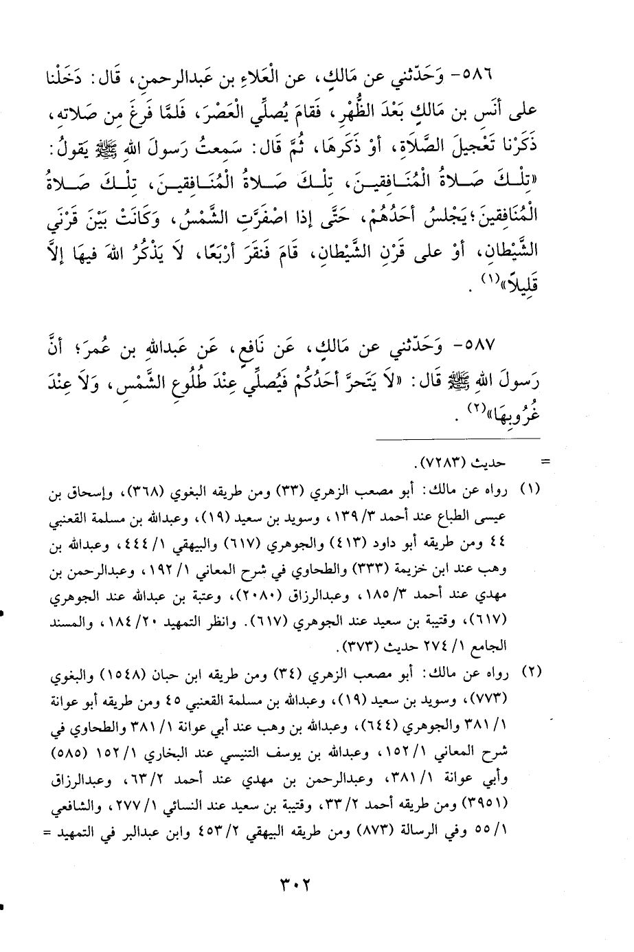 586 - وَحَدَّثَنِي عَنْ مالِكٍ، عَنِ الْعَلاَءِ بْنِ عَبْدِ الرَّحْمَنِ، قَالَ: دَخَلْنَا عَلَى أَنَسِ بْنِ مَالِكٍ بَعْدَ الظُّهْرِ، فَقَامَ يُصَلِّي الْعَصْرَ، فَلَمَّا فَرَغَ مِنْ صَلاَتِهِ، ذَكَرْنَا تَعْجِيلَ الصَّلاَةِ، أَوْ ذَكَرَهَا، ثُمَّ قَالَ: سَمِعْتُ رَسُولَ اللهِ صَلى الله عَلَيهِ وَسَلمَ يَقُولُ: تِلْكَ صَلاَةُ الْمُنَافِقِينَ، تِلْكَ صَلاَةُ الْمُنَافِقِينَ، تِلْكَ صَلاَةُ الْمُنَافِقِينَ، يَجْلِسُ أَحَدُهُمْ، حَتَّى إِذَا اصْفَرَّتِ الشَّمْسُ، وَكَانَتْ بَيْنَ قَرْنَيِ الشَّيْطَانِ، أَوْ عَلَى قَرْنِ الشَّيْطَانِ، قَامَ فَنَقَرَ أَرْبَعًا، لاَ يَذْكُرُ اللهَ فِيهَا إِلاَّ قَلِيلاً.