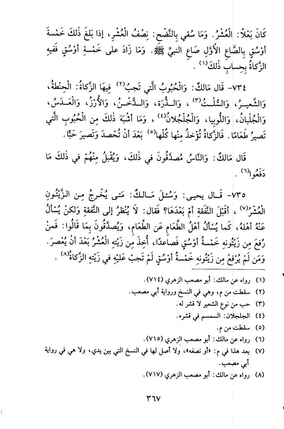 734- قَالَ مَالِكٌ: وَالْحُبُوبُ الَّتِي تَجِبُ فِيهَا الزَّكَاةُ: الْحِنْطَةُ، وَالشَّعِيرُ، وَالسُّلْتُ، وَالذُّرَةُ، وَالدُّخْنُ، وَالأَرْزُ، وَالْعَدَسُ، وَالْجُلْبَانُ، وَاللُّوبِيَا، وَالْجُلْجُلاَنُ، وَمَا أَشْبَهَ ذَلِكَ مِنَ الْحُبُوبِ الَّتِي تَصِيرُ طَعَامًا، فَالزَّكَاةُ تُؤْخَذُ مِنْهَا كُلّهَا، بَعْدَ أَنْ تُحْصَدَ وَتَصِيرَ حَبًّا.