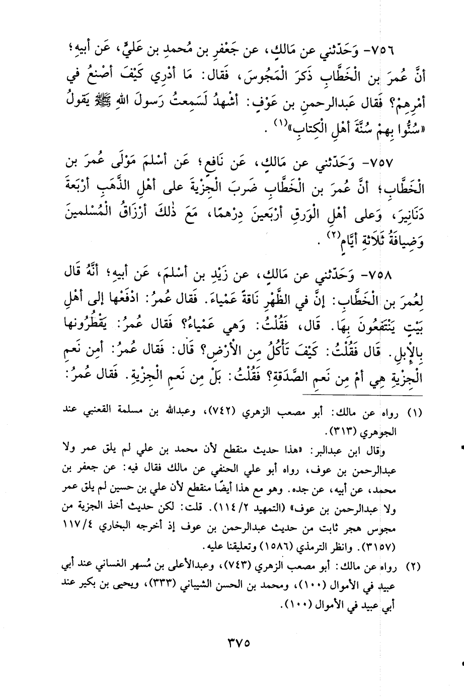 756 - وَحَدَّثَنِي عَنْ مَالِكٍ، عَنْ جَعْفَرِ بْنِ مُحَمَّدِ بْنِ عَلِيٍّ، عَنْ أَبِيهِ، أَنَّ عُمَرَ بْنَ الْخَطَّابِ ذَكَرَ الْمَجُوسَ، فَقَالَ: مَا أَدْرِي كَيْفَ أَصْنَعُ فِي أَمْرِهِمْ؟ فَقَالَ عَبْدُ الرَّحْمَنِ بْنُ عَوْفٍ: أَشْهَدُ لَسَمِعْتُ رَسُولَ اللهِ صَلى الله عَلَيهِ وَسَلمَ يَقُولُ: سُنُّوا بِهِمْ سُنَّةَ أَهْلِ الْكِتَابِ.