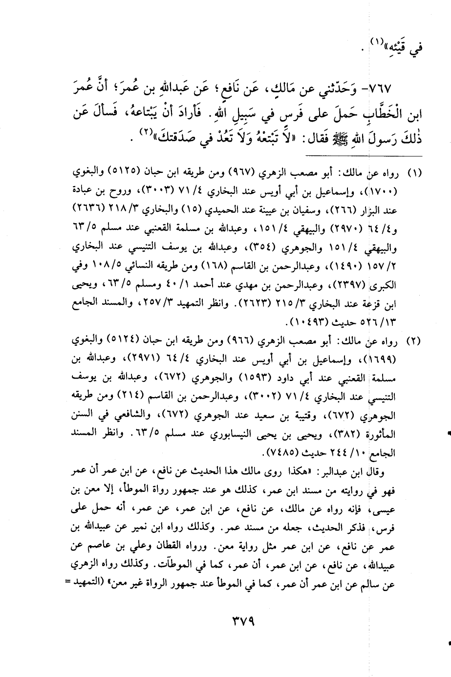 767- وَحَدَّثَنِي عَنْ مَالِكٍ، عَنْ نَافِعٍ، عَنْ عَبْدِ اللهِ بْنِ عُمَرَ؛ أَنَّ عُمَرَ بْنَ الْخَطَّابِ حَمَلَ عَلَى فَرَسٍ فِي سَبِيلِ اللهِ، فَأَرَادَ أَنْ يَبْتَاعَهُ، فَسَأَلَ عَنْ ذَلِكَ رَسُولَ اللهِ صَلى الله عَلَيهِ وَسَلمَ فَقَالَ: لاَ تَبْتَعْهُ، وَلاَ تَعُدْ فِي صَدَقَتِكَ.