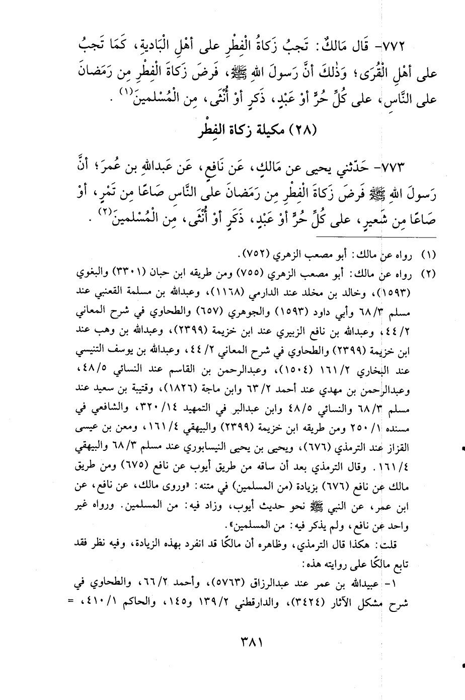 772- قَالَ مَالِكٌ: تَجِبُ زَكَاةُ الْفِطْرِ عَلَى أَهْلِ الْبَادِيَةِ، كَمَا تَجِبُ عَلَى أَهْلِ الْقُرَى، وَذَلِكَ أَنَّ رَسُولَ اللهِ صَلى الله عَلَيهِ وَسَلمَ فَرَضَ زَكَاةَ الْفِطْرِ مِنْ رَمَضَانَ عَلَى النَّاسِ، عَلَى كُلِّ حُرٍّ أَوْ عَبْدٍ، ذَكَرٍ أَوْ أُنْثَى، مِنَ الْمُسْلِمِينَ.