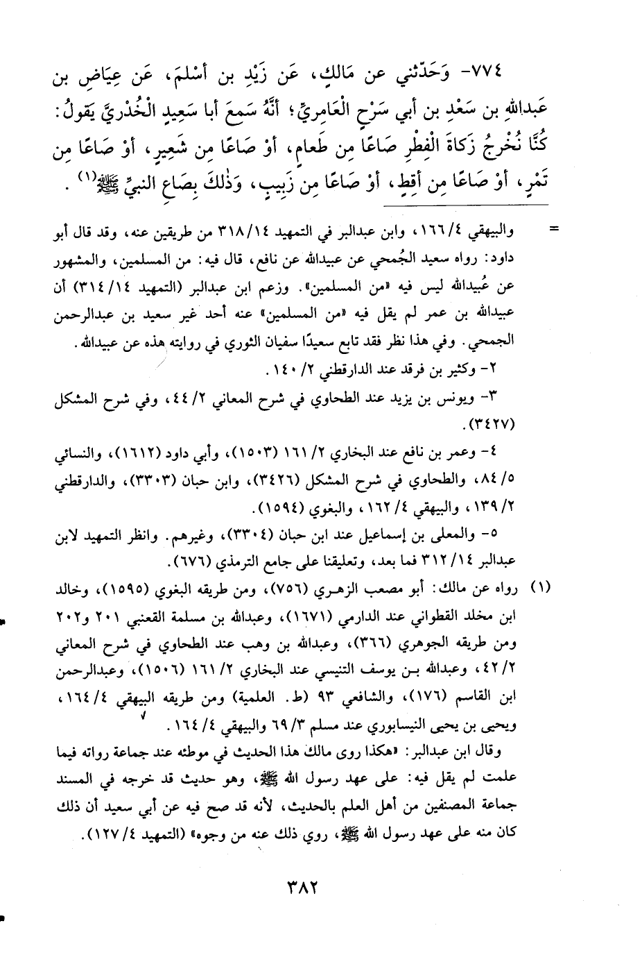 774- وَحَدَّثَنِي عَنْ مَالِكٍ، عَنْ زَيْدِ بْنِ أَسْلَمَ، عَنْ عِيَاضِ بْنِ عَبْدِ اللهِ بْنِ سَعْدِ بْنِ أَبِي سَرْحٍ الْعَامِرِيِّ، أَنَّهُ سَمِعَ أَبَا سَعِيدٍ الْخُدْرِيَّ يَقُولُ: كُنَّا نُخْرِجُ زَكَاةَ الْفِطْرِ صَاعًا مِنْ طَعَامٍ، أَوْ صَاعًا مِنْ شَعِيرٍ، أَوْ صَاعًا مِنْ تَمْرٍ، أَوْ صَاعًا مِنْ أَقِطٍ، أَوْ صَاعًا مِنْ زَبِيبٍ، وَذَلِكَ بِصَاعِ النَّبِيِّ صَلى الله عَلَيهِ وَسَلمَ.