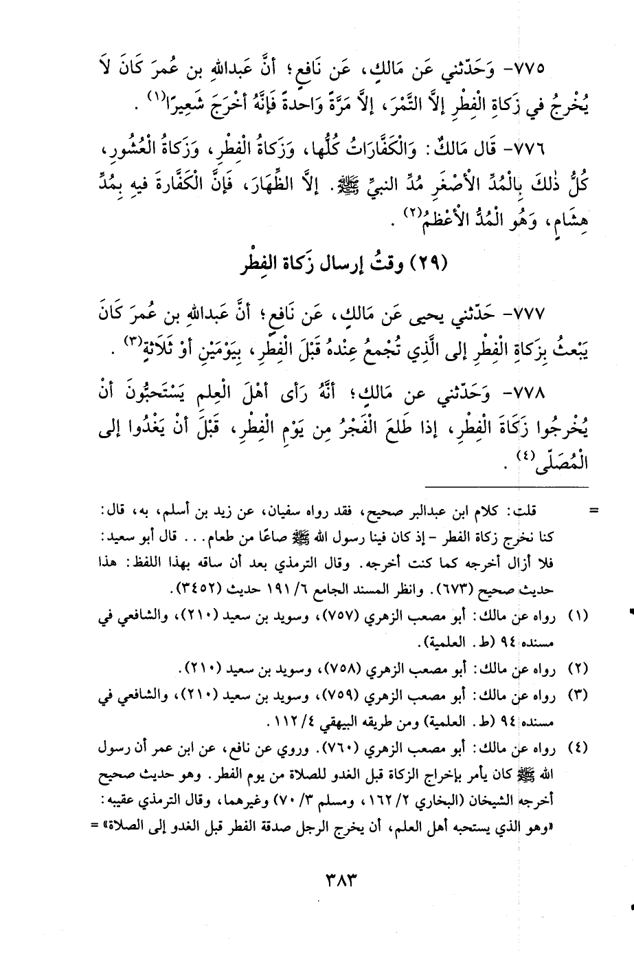 777- حَدَّثَنِي يَحْيَى، عَنْ مَالِكٍ (1)، عَنْ نَافِعٍ، أَنَّ عَبْدَ اللهِ بْنَ عُمَرَ كَانَ يَبْعَثُ بِزَكَاةِ الْفِطْرِ إِلَى الَّذِي تُجْمَعُ عِنْدَهُ قَبْلَ الْفِطْرِ، بِيَوْمَيْنِ أَوْ ثَلاَثَةٍ.