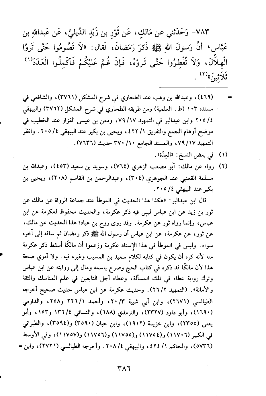 783- وَحَدَّثَنِي عَنْ مَالِكٍ، عَنْ ثَوْرِ بْنِ زَيْدٍ الدِّيلِيِّ، عَنْ عَبْدِ اللهِ بْنِ عَبَّاسٍ؛ أَنَّ رَسُولَ اللهِ صَلى الله عَلَيهِ وَسَلمَ ذَكَرَ رَمَضَانَ فَقَالَ: لاَ تَصُومُوا حَتَّى تَرَوُا الْهِلاَلَ، وَلاَ تُفْطِرُوا حَتَّى تَرَوْهُ، فَإِنْ غُمَّ عَلَيْكُمْ، فَأَكْمِلُوا الْعَدَدَ ثَلاَثِينَ.