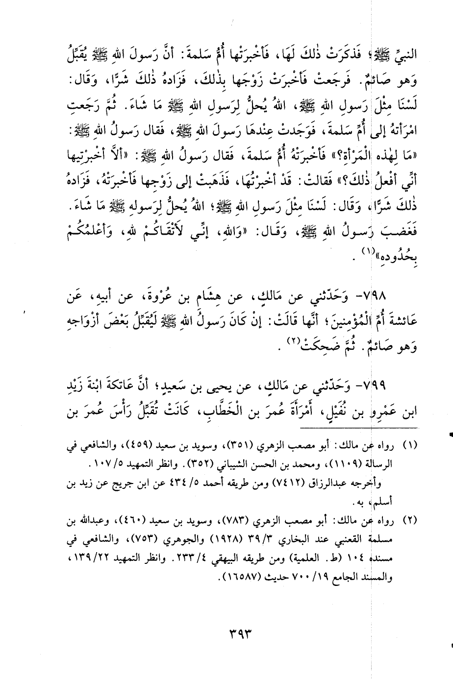 798- وَحَدَّثَنِي عَنْ مَالِكٍ، عَنْ هِشَامِ بْنِ عُرْوَةَ، عَنْ أَبِيهِ، عَنْ عَائِشَةَ، أُمِّ الْمُؤْمِنِينَ، أَنَّهَا قَالَتْ: إِنْ كَانَ رَسُولُ اللهِ صَلى الله عَلَيهِ وَسَلمَ لَيُقَبِّلُ بَعْضَ أَزْوَاجِهِ وَهُوَ صَائِمٌ، ثُمَّ ضَحِكَتْ.