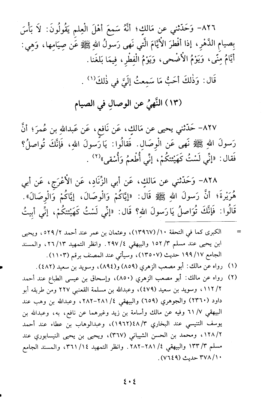 827- حَدَّثَنِي يَحْيَى، عَنْ مَالِكٍ (1)، عَنْ نَافِعٍ، عَنْ عَبْدِ اللهِ بْنِ عُمَرَ؛ أَنَّ رَسُولَ اللهِ صَلى الله عَلَيهِ وَسَلمَ نَهَى عَنِ الْوِصَالِ، فَقَالُوا: يَا رَسُولَ اللهِ، فَإِنَّكَ تُوَاصِلُ؟ فَقَالَ: إِنِّي لَسْتُ كَهَيْئَتِكُمْ، إِنِّي أُطْعَمُ وَأُسْقَى.