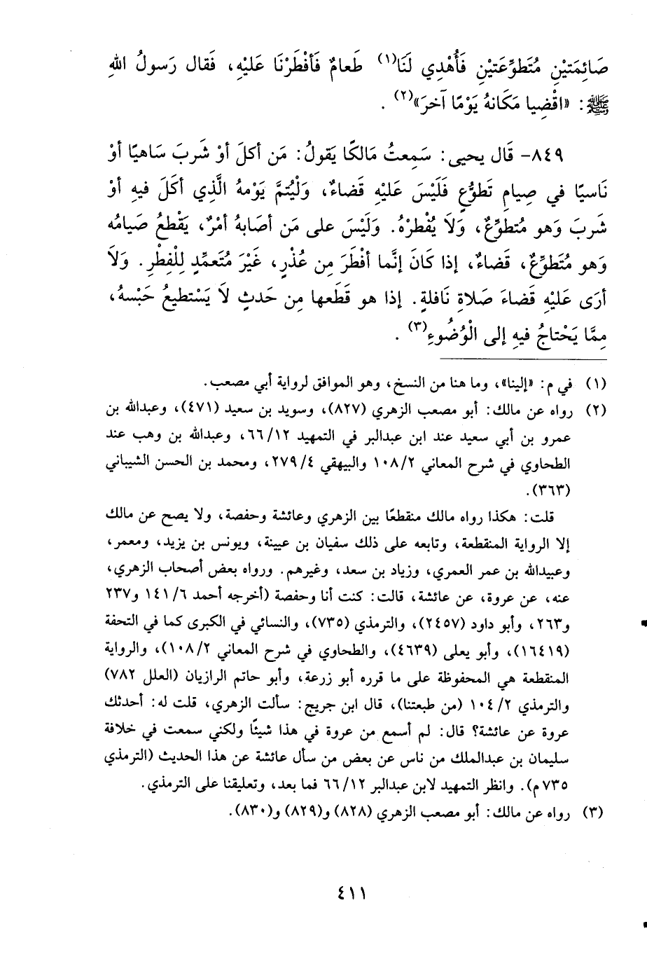 848- حَدَّثَنِي يَحْيَى، عَنْ مَالِكٍ، عَنِ ابْنِ شِهَابٍ، أَنَّ عَائِشَةَ، وَحَفْصَةَ، زَوْجَيِ النَّبِيِّ صَلى الله عَلَيهِ وَسَلمَ أَصْبَحَتَا صَائِمَتَيْنِ مُتَطَوِّعَتَيْنِ، فَأُهْدِيَ لَهُمَا طَعَامٌ، فَأَفْطَرَتَا عَلَيْهِ، فَدَخَلَ عَلَيْهِمَا رَسُولُ اللهِ صَلى الله عَلَيهِ وَسَلمَ، قَالَتْ عَائِشَةُ: فَقَالَتْ حَفْصَةُ، وَبَدَرَتْنِي بِالْكَلاَمِ، وَكَانَتْ بِنْتَ أَبِيهَا: يَا رَسُولَ اللهِ، إِنِّي أَصْبَحْتُ أَنَا وَعَائِشَةُ صَائِمَتَيْنِ مُتَطَوِّعَتَيْنِ، فَأُهْدِيَ إِلَيْنَا طَعَامٌ، فَأَفْطَرْنَا عَلَيْهِ، فَقَالَ رَسُولُ اللهِ صَلى الله عَلَيهِ وَسَلمَ: اقْضِيَا مَكَانَهُ يَوْمًا آخَرَ.