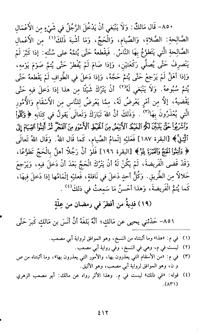850 - قَالَ مَالِكٌ: وَلاَ يَنْبَغِي أَنْ يَدْخُلَ الرَّجُلُ فِي شَيْءٍ مِنَ الأَعْمَالِ الصَّالِحَةِ: الصَّلاَةِ، وَالصِّيَامِ، وَالْحَجِّ، وَمَا أَشْبَهَ ذَلِكَ مِنَ الأَعْمَالِ الصَّالِحَةِ الَّتِي يَتَطَوَّعُ بِهَا النَّاسُ، فَيَقْطَعَهُ حَتَّى يُتِمَّهُ عَلَى سُنَّتِهِ: إِذَا كَبَّرَ لَمْ يَنْصَرِفْ حَتَّى يُصَلِّيَ رَكْعَتَيْنِ، وَإِذَا صَامَ لَمْ يُفْطِرْ حَتَّى يُتِمَّ صَوْمَ يَوْمِهِ، وَإِذَا أَهَلَّ لَمْ يَرْجِعْ حَتَّى يُتِمَّ حَجَّهُ، وَإِذَا دَخَلَ فِي الطَّوَافِ لَمْ يَقْطَعْهُ حَتَّى يُتِمَّ سُبُوعَهُ، وَلاَ يَنْبَغِي لَهُ أَنْ يَتْرُكَ شَيْئًا مِنْ هَذَا إِذَا دَخَلَ فِيهِ حَتَّى يَقْضِيَهُ، إِلاَّ مِنْ أَمْرٍ يَعْرِضُ لَهُ، مِمَّا يَعْرِضُ لِلنَّاسِ، مِنَ الأَسْقَامِ وَالأُمُورِ الَّتِي يُعْذَرُونَ بِهَا، وَذَلِكَ أَنَّ اللهَ تَبَارَكَ وَتَعَالَى يَقُولُ فِي كِتَابِهِ: {وَكُلُوا وَاشْرَبُوا حَتَّى يَتَبَيَّنَ لَكُمُ الْخَيْطُ الأَبْيَضُ مِنَ الْخَيْطِ الأَسْوَدِ مِنَ الْفَجْرِ ثُمَّ أَتِمُّوا الصِّيَامَ إِلَى اللَّيْلِ} فَعَلَيْهِ إِتْمَامُ الصِّيَامِ، كَمَا قَالَ اللهُ، وَقَالَ اللهُ تَعَالَى: {وَأَتِمُّوا الْحَجَّ وَالْعُمْرَةَ لِلَّهِ} فَلَوْ أَنَّ رَجُلاً أَهَلَّ بِالْحَجِّ تَطَوُّعًا وَقَدْ قَضَى الْفَرِيضَةَ، لَمْ يَكُنْ لَهُ أَنْ يَتْرُكَ الْحَجَّ بَعْدَ أَنْ دَخَلَ فِيهِ، وَيَرْجِعَ حَلاَلاً مِنَ الطَّرِيقِ، وَكُلُّ أَحَدٍ دَخَلَ فِي نَافِلَةٍ فَعَلَيْهِ إِتْمَامُهَا إِذَا دَخَلَ فِيهَا، كَمَا يُتِمُّ الْفَرِيضَةَ، وَهَذَا أَحْسَنُ مَا سَمِعْتُ فِي ذَلِكَ.