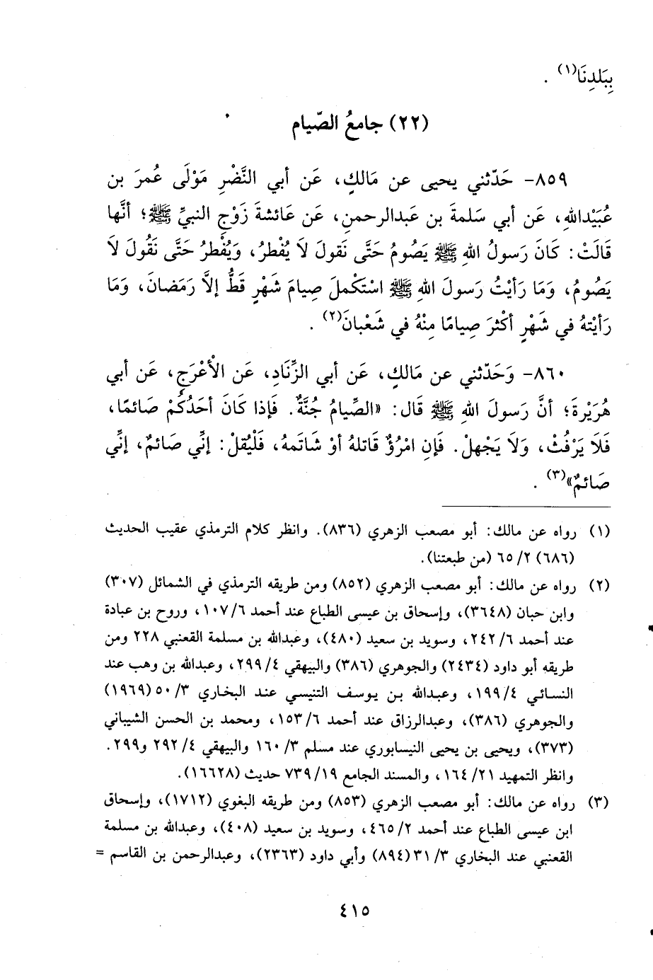 860- وَحَدَّثَنِي عَنْ مَالِكٍ، عَنْ أَبِي الزِّنَادِ، عَنِ الأَعْرَجِ، عَنْ أَبِي هُرَيْرَةَ، أَنَّ رَسُولَ اللهِ صَلى الله عَلَيهِ وَسَلمَ قَالَ: الصِّيَامُ جُنَّةٌ، فَإِذَا كَانَ أَحَدُكُمْ صَائِمًا، فَلاَ يَرْفُثْ، وَلاَ يَجْهَلْ، فَإِنِ امْرُؤٌ قَاتَلَهُ أَوْ شَاتَمَهُ، فَلْيَقُلْ: إِنِّي صَائِمٌ، إِنِّي صَائِمٌ.