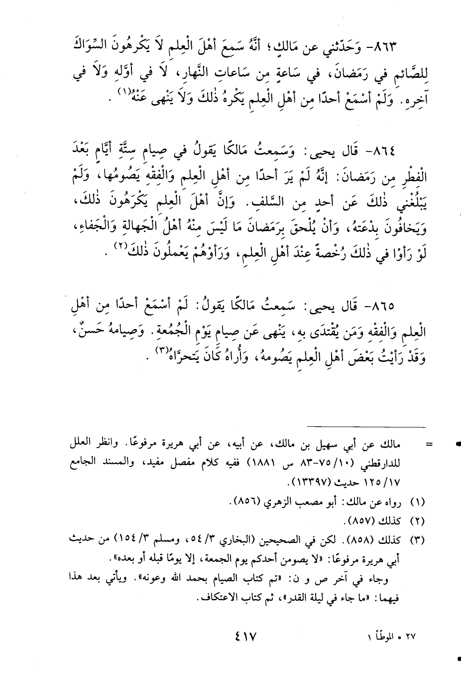 863- وَحَدَّثَنِي عَنْ مالِكٍ، أَنَّهُ سَمِعَ أَهْلَ الْعِلْمِ لاَ يَكْرَهُونَ السِّوَاكَ لِلصَّائِمِ فِي رَمَضَانَ، فِي سَاعَةٍ مِنْ سَاعَاتِ النَّهَارِ، لاَ فِي أَوَّلِهِ وَلاَ فِي آخِرِهِ، وَلَمْ أَسْمَعْ أَحَدًا مِنْ أَهْلِ الْعِلْمِ يَكْرَهُ ذَلِكَ، وَلاَ يَنْهَى عَنْهُ.