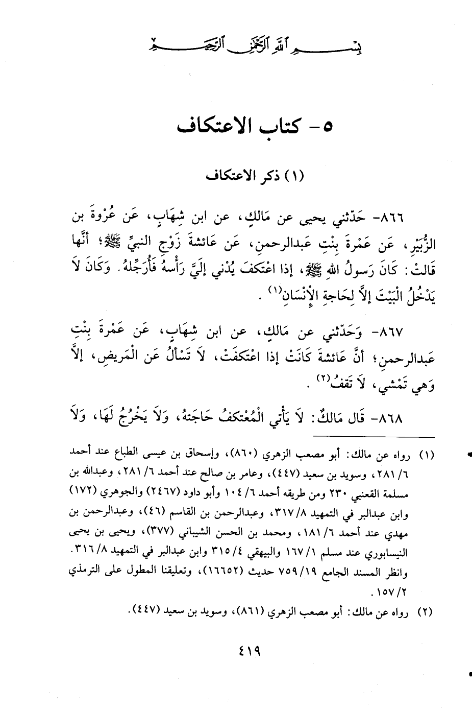 866 - حَدَّثَنِي يَحْيَى، عَنْ مَالِكٍ، عَنِ ابْنِ شِهَابٍ، عَنْ عُرْوَةَ بْنِ الزُّبَيْرِ، عَنْ عَمْرَةَ بِنْتِ عَبْدِ الرَّحْمَنِ، عَنْ عَائِشَةَ، زَوْجِ النَّبِيِّ صَلى الله عَلَيهِ وَسَلمَ، أَنَّهَا قَالَتْ: كَانَ رَسُولُ اللهِ صَلى الله عَلَيهِ وَسَلمَ إِذَا اعْتَكَفَ يُدْنِي إِلَيَّ رَأْسَهُ، فَأُرَجِّلُهُ، وَكَانَ لاَ يَدْخُلُ الْبَيْتَ إِلاَّ لِحَاجَةِ الإِنْسَانِ.
