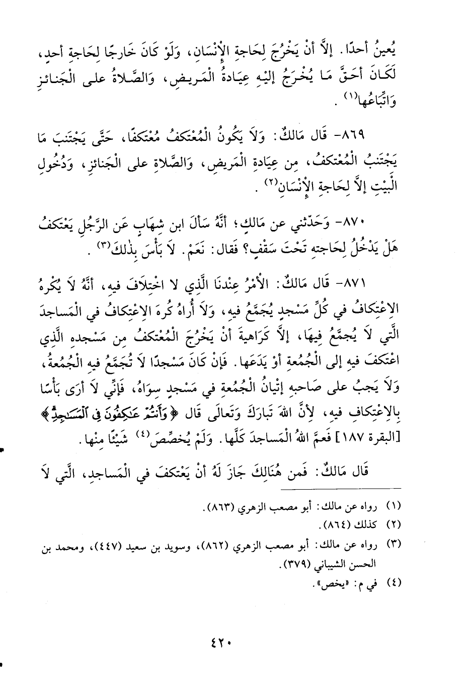 869- قَالَ مَالِكٌ: وَلاَ يَكُونُ الْمُعْتَكِفُ مُعْتَكِفًا حَتَّى يَجْتَنِبَ مَا يَجْتَنِبُ الْمُعْتَكِفُ مِنْ عِيَادَةِ الْمَرِيضِ، وَالصَّلاَةِ عَلَى الْجَنَائِزِ، وَدُخُولِ الْبَيْتِ، إِلاَّ لِحَاجَةِ الإِنْسَانِ.