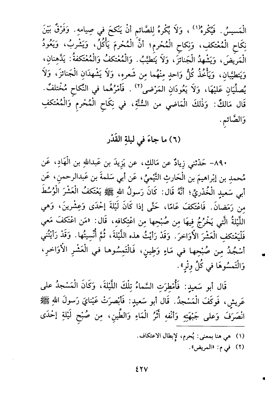 890- حَدَّثَنِي زِيَادٌ، عَنْ مَالِكٍ، عَنْ يَزِيدَ بْنِ عَبْدِ اللهِ بْنِ الْهَادِ، عَنْ مُحَمَّدِ بْنِ إِبْرَاهِيمَ بْنِ الْحَارِثِ التَّيْمِيِّ، عَنْ أَبِي سَلَمَةَ بْنِ عَبْدِ الرَّحْمَنِ، عَنْ أَبِي سَعِيدٍ الْخُدْرِيِّ، أَنَّهُ قَالَ: كَانَ رَسُولُ اللهِ صَلى الله عَلَيهِ وَسَلمَ يَعْتَكِفُ الْعَشْرَ الْوُسُطَ مِنْ رَمَضَانَ، فَاعْتَكَفَ عَامًا، حَتَّى إِذَا كَانَ لَيْلَةَ إِحْدَى وَعِشْرِينَ، وَهِيَ اللَّيْلَةُ الَّتِي يَخْرُجُ فِيهَا مِنْ صُبْحِهَا مِنِ اعْتِكَافِهِ، قَالَ: مَنِ اعْتَكَفَ مَعِيَ، فَلْيَعْتَكِفِ الْعَشْرَ الأَوَاخِرَ، وَقَدْ رَأَيْتُ هَذِهِ اللَّيْلَةَ، ثُمَّ أُنْسِيتُهَا، وَقَدْ رَأَيْتُنِي أَسْجُدُ مِنْ صُبْحِهَا فِي مَاءٍ وَطِينٍ، فَالْتَمِسُوهَا فِي الْعَشْرِ الأَوَاخِرِ، وَالْتَمِسُوهَا فِي كُلِّ وِتْرٍ.