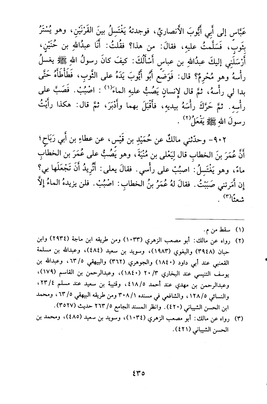 902- وحَدَّثَنِي مَالِكٌ، عَنْ حُمَيْدِ بْنِ قَيْسٍ، عَنْ عَطَاءِ بْنِ أَبِي رَبَاحٍ، أَنَّ عُمَرَ بْنَ الْخَطَّابِ قَالَ لِيَعْلَى بْنِ مُنْيَةَ وَهُوَ يَصُبُّ عَلَى عُمَرَ بْنِ الْخَطَّابِ مَاءً، وَهُوَ يَغْتَسِلُ: اصْبُبْ عَلَى رَأْسِي، فَقَالَ يَعْلَى: أَتُرِيدُ أَنْ تَجْعَلَهَا بِي؟ إِنْ أَمَرْتَنِي صَبَبْتُ، فَقَالَ لَهُ عُمَرُ بْنُ الْخَطَّابِ: اصْبُبْ، فَلَنْ يَزِيدَهُ الْمَاءُ إِلاَّ شَعَثًا.