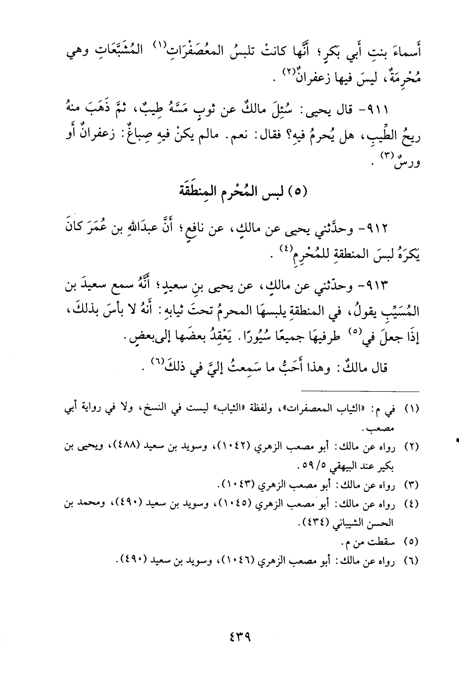 910- وَحَدَّثَنِي عَنْ مَالِكٍ، عَنْ هِشَامِ بْنِ عُرْوَةَ، عَنْ أَبِيهِ، عَنْ أَسْمَاءَ بِنْتِ أَبِي بَكْرٍ، أَنَّهَا كَانَتْ تَلْبَسُ الْمُعَصْفَرَاتِ الْمُشَبَّعَاتِ، وَهِيَ مُحْرِمَةٌ لَيْسَ فِيهَا زَعْفَرَانٌ.