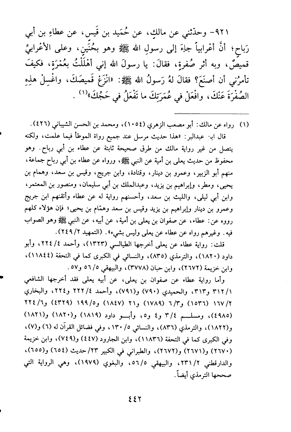 921- وَحَدَّثَنِي عَنْ مَالِكٍ، عَنْ حُمَيْدِ بْنِ قَيْسٍ، عَنْ عَطَاءِ بْنِ أَبِي رَبَاحٍ، أَنَّ أَعْرَابِيًّا جَاءَ إِلَى رَسُولِ اللهِ صَلى الله عَلَيهِ وَسَلمَ وَهُوَ بِحُنَيْنٍ، وَعَلَى الأَعْرَابِيِّ قَمِيصٌ، وَبِهِ أَثَرُ صُفْرَةٍ، فَقَالَ: يَا رَسُولَ اللهِ، إِنِّي أَهْلَلْتُ بِعُمْرَةٍ، فَكَيْفَ تَأْمُرُنِي أَنْ أَصْنَعَ؟ فَقَالَ لَهُ رَسُولُ اللهِ صَلى الله عَلَيهِ وَسَلمَ: انْزَعْ قَمِيصَكَ، وَاغْسِلْ هَذِهِ الصُّفْرَةَ عَنْكَ، وَافْعَلْ فِي عُمْرَتِكَ مَا تَفْعَلُ فِي حَجِّكَ.