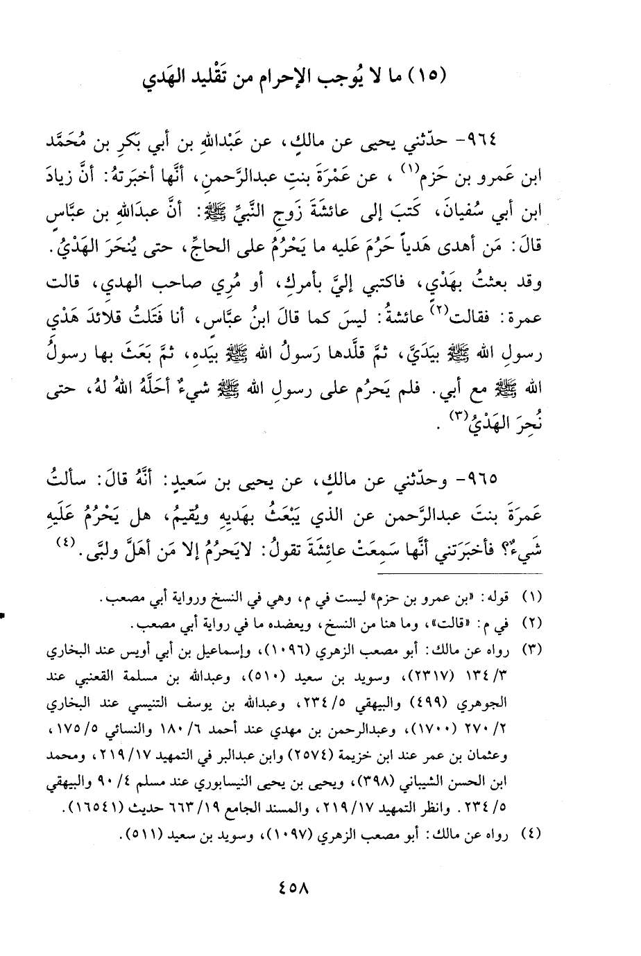 964- حَدَّثَنِي يَحْيَى، عَنْ مَالِكٍ، عَنْ عَبْدِ اللهِ بْنِ أَبِي بَكْرِ بْنِ مُحَمَّدِ بْنِ عَمْرِو بْنِ حَزْمٍ، عَنْ عَمْرَةَ بِنْتِ عَبْدِ الرَّحْمَنِ، أَنَّهَا أَخْبَرَتْهُ: أَنَّ زِيَادَ بْنَ أَبِي سُفْيَانَ كَتَبَ إِلَى عَائِشَةَ، زَوْجِ النَّبِيِّ صَلى الله عَلَيهِ وَسَلمَ، أَنَّ عَبْدَ اللهِ بْنَ عَبَّاسٍ قَالَ: مَنْ أَهْدَى هَدْيًا حَرُمَ عَلَيْهِ مَا يَحْرُمُ عَلَى الْحَاجِّ، حَتَّى يُنْحَرَ الْهَدْيُ، وَقَدْ بَعَثْتُ بِهَدْيٍ، فَاكْتُبِي إِلَيَّ بِأَمْرِكِ، أَوْ مُرِي صَاحِبَ الْهَدْيِ، قَالَتْ عَمْرَةُ: قَالَتْ عَائِشَةُ: لَيْسَ كَمَا قَالَ ابْنُ عَبَّاسٍ، أَنَا فَتَلْتُ قَلاَئِدَ هَدْيِ رَسُولِ اللهِ صَلى الله عَلَيهِ وَسَلمَ بِيَدَيَّ، ثُمَّ قَلَّدَهَا رَسُولُ اللهِ صَلى الله عَلَيهِ وَسَلمَ بِيَدِهِ، ثُمَّ بَعَثَ بِهَا رَسُولُ اللهِ صَلى الله عَلَيهِ وَسَلمَ مَعَ أَبِي، فَلَمْ يَحْرُمْ عَلَى رَسُولِ اللهِ صَلى الله عَلَيهِ وَسَلمَ شَيْءٌ أَحَلَّهُ اللهُ لَهُ حَتَّى نُحِرَ الْهَدْيُ.