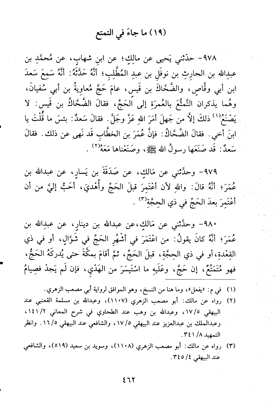 978- حَدَّثَنِي يَحْيَى، عَنْ مَالِكٍ، عَنِ ابْنِ شِهَابٍ، عَنْ مُحَمَّدِ بْنِ عَبْدِ اللهِ بْنِ الْحَارِثِ بْنِ نَوْفَلِ بْنِ عَبْدِ الْمُطَّلِبِ، أَنَّهُ حَدَّثَهُ، أَنَّهُ سَمِعَ سَعْدَ بْنَ أَبِي وَقَّاصٍ، وَالضَّحَّاكَ بْنَ قَيْسٍ عَامَ حَجَّ مُعَاوِيَةُ بْنُ أَبِي سُفْيَانَ، وَهُمَا يَذْكُرَانِ التَّمَتُّعَ بِالْعُمْرَةِ إِلَى الْحَجِّ، فَقَالَ الضَّحَّاكُ بْنُ قَيْسٍ: لاَ يَصْنَعُ ذَلِكَ إِلاَّ مَنْ جَهِلَ أَمْرَ اللهِ عَزَّ وَجَلَّ، فَقَالَ سَعْدٌ: بِئْسَ مَا قُلْتَ يَا ابْنَ أَخِي، فَقَالَ الضَّحَّاكُ: فَإِنَّ عُمَرَ بْنَ الْخَطَّابِ قَدْ نَهَى عَنْ ذَلِكَ، فَقَالَ سَعْدٌ: قَدْ صَنَعَهَا رَسُولُ اللهِ صَلى الله عَلَيهِ وَسَلمَ، وَصَنَعْنَاهَا مَعَهُ.