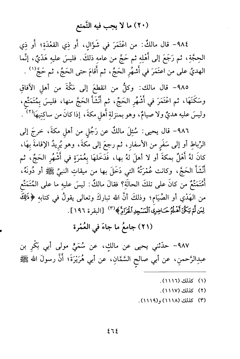 986 - قَالَ يَحْيَى: سُئِلَ مَالِكٌ عَنْ رَجُلٍ مِنْ أَهْلِ مَكَّةَ، خَرَجَ إِلَى الرِّبَاطِ أَوْ إِلَى سَفَرٍ مِنَ الأَسْفَارِ، ثُمَّ رَجَعَ إِلَى مَكَّةَ، وَهُوَ يُرِيدُ الإِقَامَةَ بِهَا، كَانَ لَهُ أَهْلٌ بِمَكَّةَ أَوْ لاَ أَهْلَ لَهُ بِهَا، فَدَخَلَهَا بِعُمْرَةٍ فِي أَشْهُرِ الْحَجِّ، ثُمَّ أَنْشَأَ الْحَجَّ، وَكَانَتْ عُمْرَتُهُ الَّتِي دَخَلَ بِهَا مِنْ مِيقَاتِ النَّبِيِّ صَلى الله عَلَيهِ وَسَلمَ أَوْ دُونَهُ، أَمُتَمَتِّعٌ مَنْ كَانَ عَلَى تِلْكَ الْحَالَةِ؟ فَقَالَ مَالِكٌ: لَيْسَ عَلَيْهِ مَا عَلَى الْمُتَمَتِّعِ مِنَ الْهَدْيِ أَوِ الصِّيَامِ، وَذَلِكَ أَنَّ اللهَ تَبَارَكَ وَتَعَالَى يَقُولُ فِي كِتَابِهِ: {ذَلِكَ لِمَنْ لَمْ يَكُنْ أَهْلُهُ حَاضِرِي الْمَسْجِدِ الْحَرَامِ}.