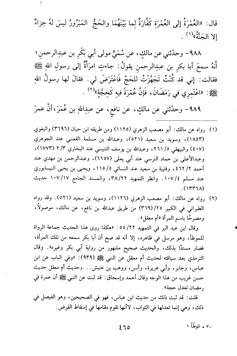988- وَحَدَّثَنِي عَنْ مَالِكٍ، عَنْ سُمَيٍّ، مَوْلَى أَبِي بَكْرِ بْنِ عَبْدِ الرَّحْمَنِ، أَنَّهُ سَمِعَ أَبَا بَكْرِ بْنَ عَبْدِ الرَّحْمَنِ يَقُولُ: جَاءَتِ امْرَأَةٌ إِلَى رَسُولِ اللهِ صَلى الله عَلَيهِ وَسَلمَ فَقَالَتْ: إِنِّي قَدْ كُنْتُ تَجَهَّزْتُ لِلْحَجِّ، فَاعْتَرَضَ لِي، فَقَالَ لَهَا رَسُولُ اللهِ صَلى الله عَلَيهِ وَسَلمَ: اعْتَمِرِي فِي رَمَضَانَ، فَإِنَّ عُمْرَةً فِيهِ كَحِجَّةٍ.