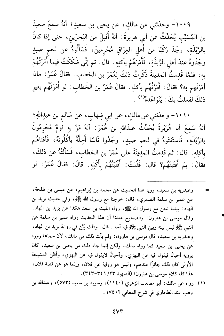 1010- وَحَدَّثَنِي عَنْ مَالِكٍ، عَنِ ابْنِ شِهَابٍ، عَنْ سَالِمِ بْنِ عَبْدِ اللهِ، أَنَّهُ سَمِعَ أَبَا هُرَيْرَةَ يُحَدِّثُ عَبْدَ اللهِ بْنَ عُمَرَ؛ أَنَّهُ مَرَّ بِهِ قَوْمٌ مُحْرِمُونَ بِالرَّبَذَةِ، فَاسْتَفْتَوْهُ فِي لَحْمِ صَيْدٍ، وَجَدُوا نَاسًا أَحِلَّةً يَأْكُلُونَهُ، فَأَفْتَاهُمْ بِأَكْلِهِ، قَالَ: ثُمَّ قَدِمْتُ الْمَدِينَةَ عَلَى عُمَرَ بْنِ الْخَطَّابِ، فَسَأَلْتُهُ عَنْ ذَلِكَ، فَقَالَ: بِمَ أَفْتَيْتَهُمْ؟ قَالَ: فَقُلْتُ: أَفْتَيْتُهُمْ بِأَكْلِهِ، قَالَ: فَقَالَ عُمَرُ: لَوْ أَفْتَيْتَهُمْ بِغَيْرِ ذَلِكَ لأَوْجَعْتُكَ.