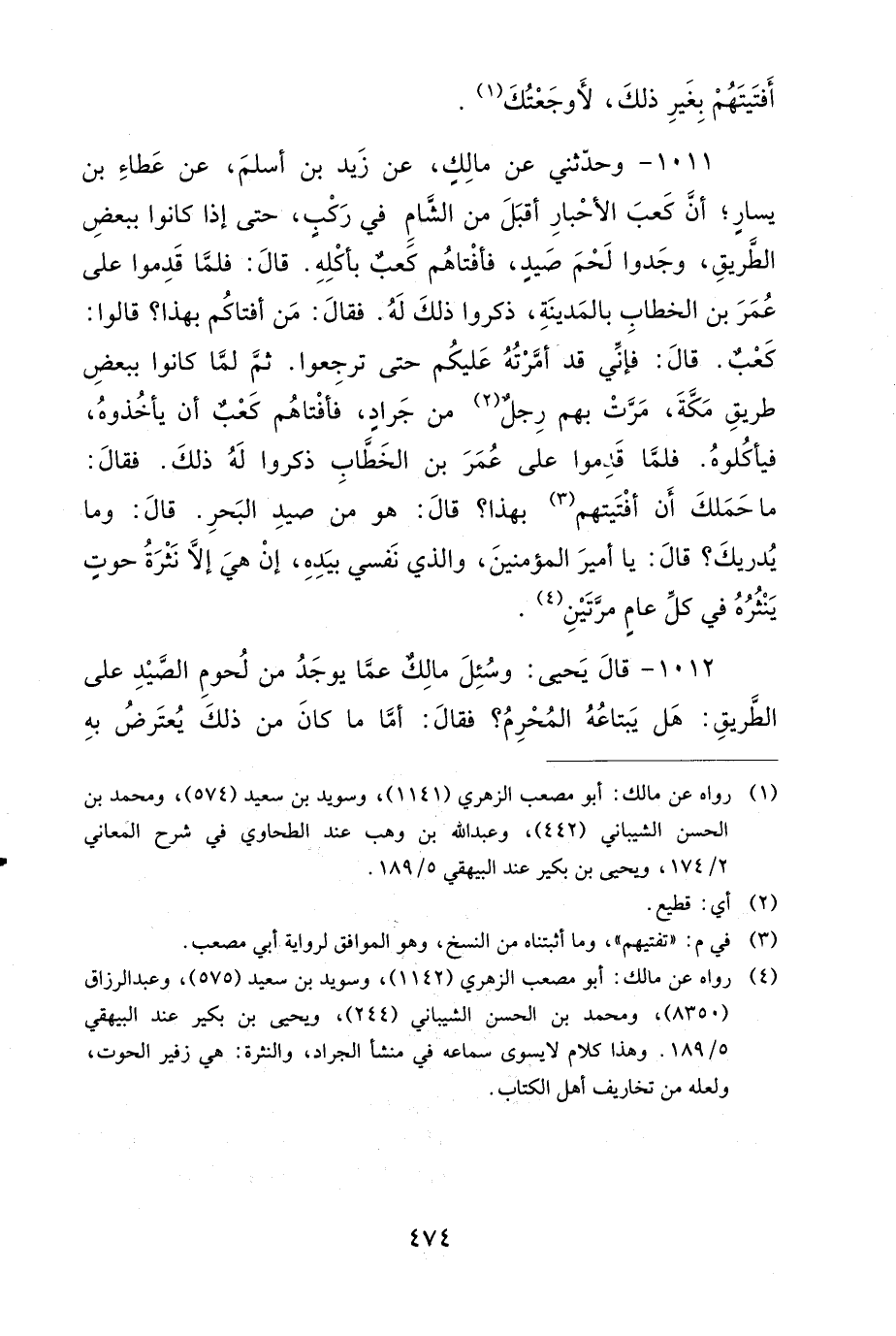 1011- وَحَدَّثَنِي عَنْ مَالِكٍ، عَنْ زَيْدِ بْنِ أَسْلَمَ، عَنْ عَطَاءِ بْنِ يَسَارٍ، أَنَّ كَعْبَ الأَحْبَارِ أَقْبَلَ مِنَ الشَّامِ فِي رَكْبٍ، حَتَّى إِذَا كَانُوا بِبَعْضِ الطَّرِيقِ، وَجَدُوا لَحْمَ صَيْدٍ، فَأَفْتَاهُمْ كَعْبٌ بِأَكْلِهِ، قَالَ: فَلَمَّا قَدِمُوا عَلَى عُمَرَ بْنِ الْخَطَّابِ بِالْمَدِينَةِ، ذَكَرُوا ذَلِكَ لَهُ، فَقَالَ: مَنْ أَفْتَاكُمْ بِهَذَا؟ قَالُوا: كَعْبٌ، قَالَ: فَإِنِّي قَدْ أَمَّرْتُهُ عَلَيْكُمْ حَتَّى تَرْجِعُوا، ثُمَّ لَمَّا كَانُوا بِبَعْضِ طَرِيقِ مَكَّةَ، مَرَّتْ بِهِمْ رِجْلٌ مِنْ جَرَادٍ، فَأَفْتَاهُمْ كَعْبٌ أَنْ يَأْخُذُوهُ، فَيَأْكُلُوهُ، فَلَمَّا قَدِمُوا عَلَى عُمَرَ بْنِ الْخَطَّابِ ذَكَرُوا لَهُ ذَلِكَ، فَقَالَ: مَا حَمَلَكَ أَنْ أَفْتَيْتَهُمْ بِهَذَا؟ قَالَ: هُوَ مِنْ صَيْدِ الْبَحْرِ، قَالَ: وَمَا يُدْرِيكَ؟ قَالَ: يَا أَمِيرَ الْمُؤْمِنِينَ، وَالَّذِي نَفْسِي بِيَدِهِ، إِنْ هِيَ إِلاَّ نَثْرَةُ حُوتٍ يَنْثُرُهُ فِي كُلِّ عَامٍ مَرَّتَيْنِ.